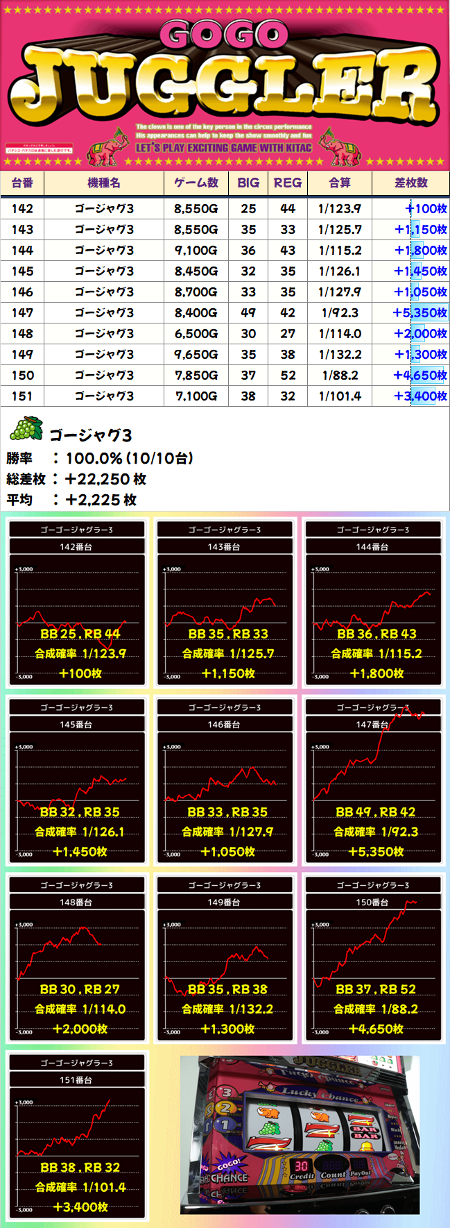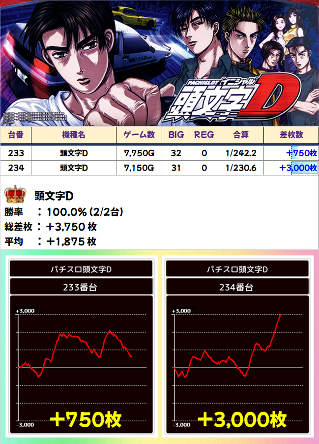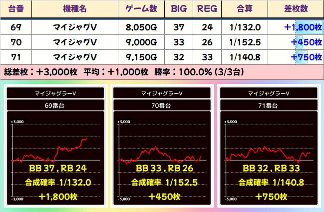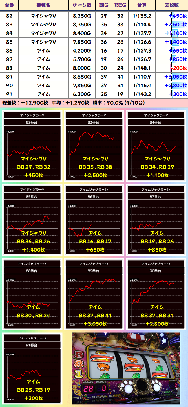 総差枚+207300枚、平均差枚+447枚と大盤振る舞い。全台系や並びの仕掛けが埋もれずに、しっかり結果を出してくれたことが分かりますね。