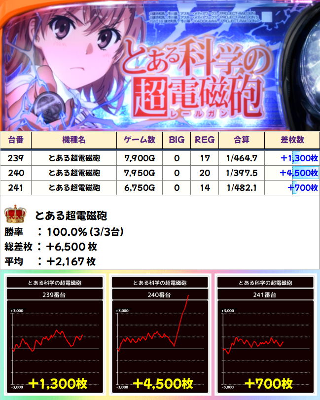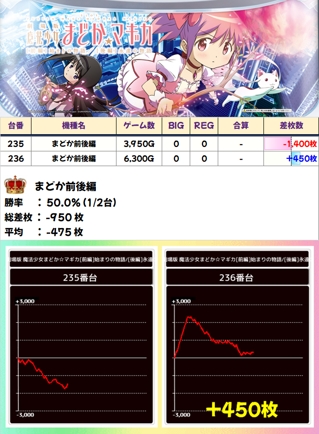 少台数の機種またぎで最も大きい並びとなったのが233~244番台の「頭文字D」「まどか前後編」「コードギアス3」「超電磁砲」「モンハンアイス」。なかにはヒキが噛み合わずマイナスとなってしまった台もありますが、回転数から見て分かる通り、強い根拠があったに違いありません。