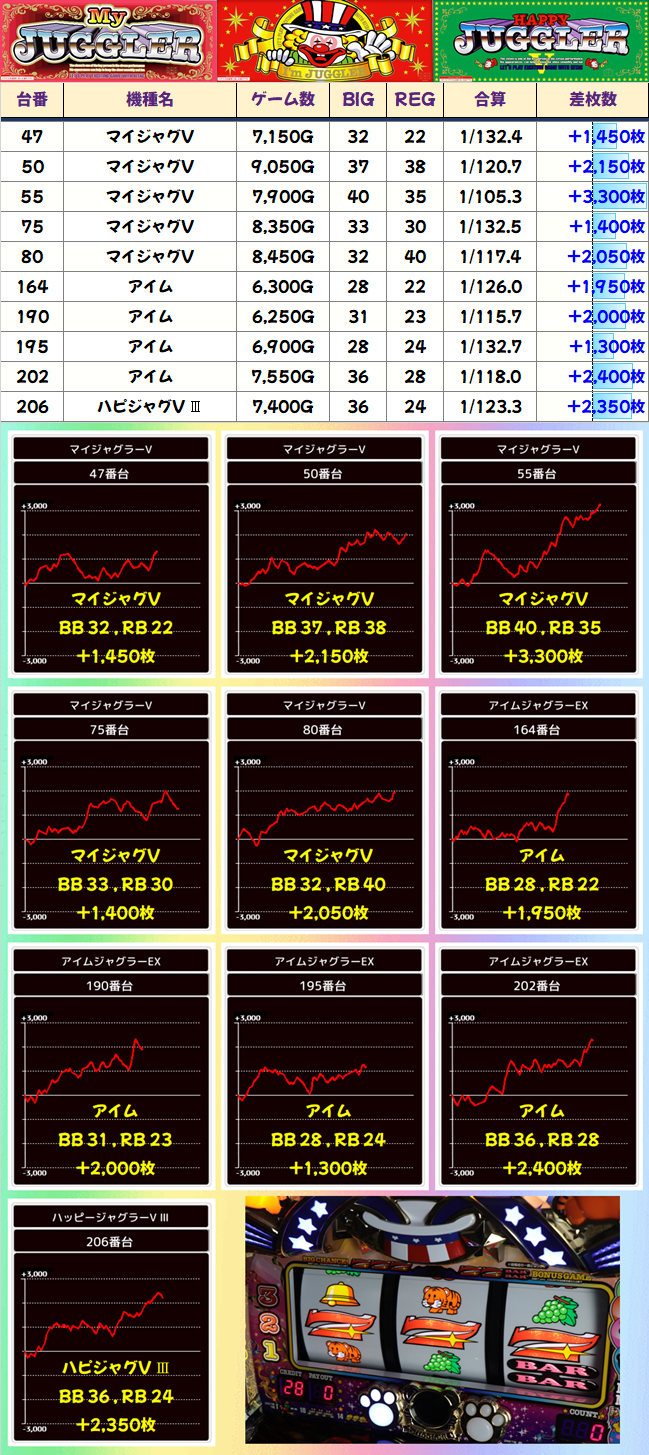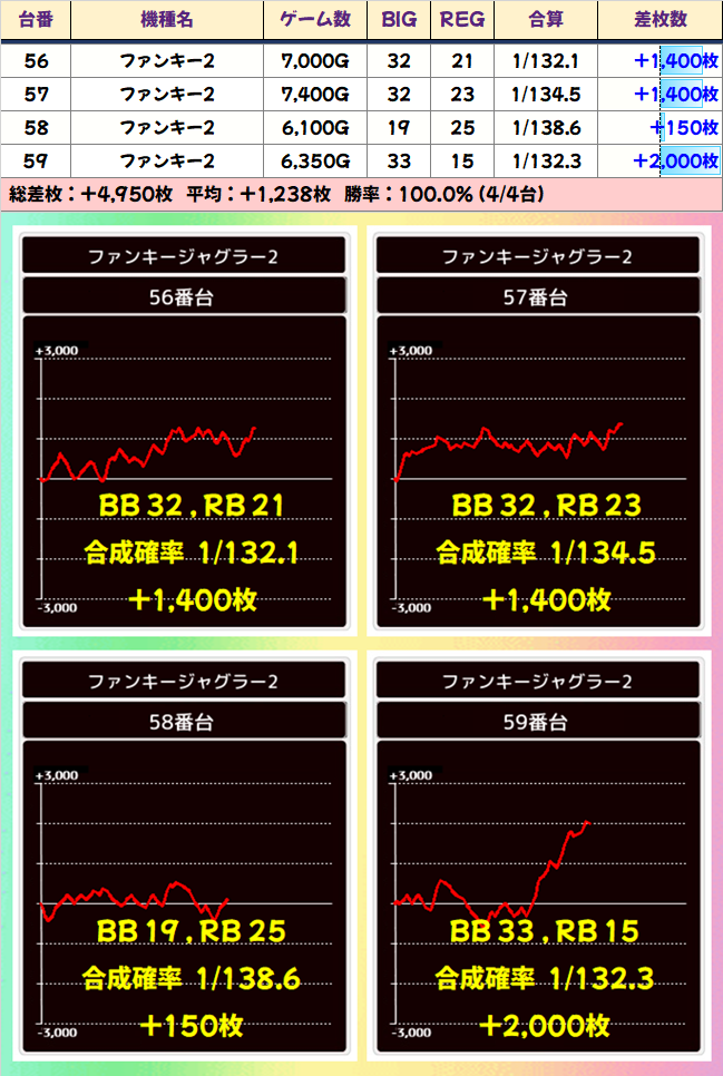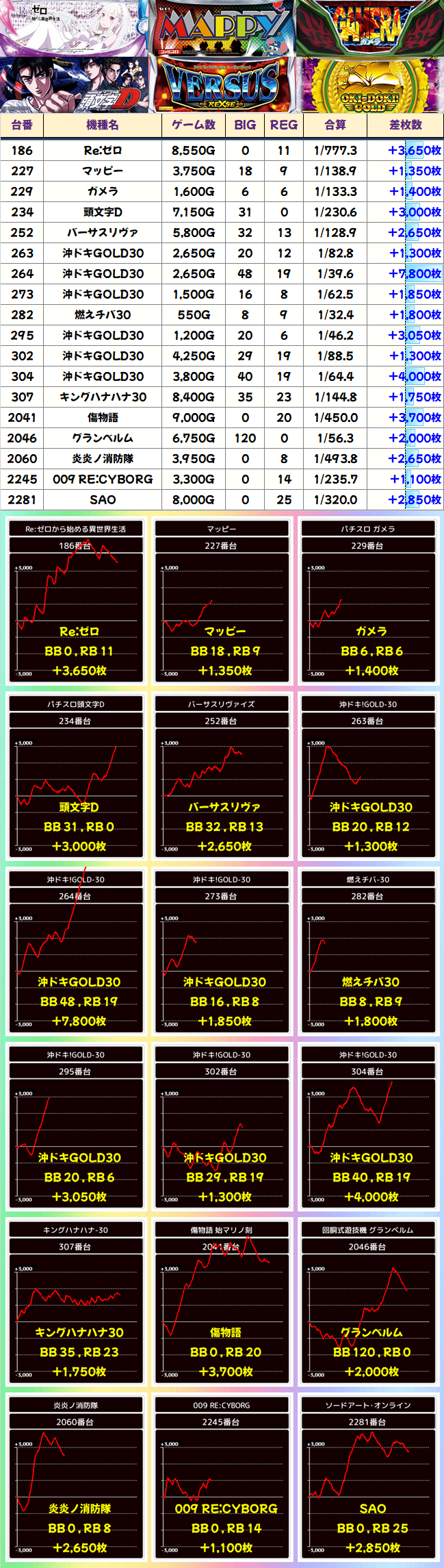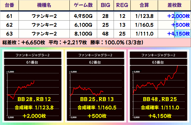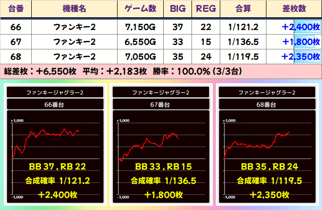 「番長ZERO」も全台系だったようです。2051番台からは+4000枚、2053番台からは+5450枚ととんでもない記録が飛び出し、平均差枚+3250枚の大勝利を納めました。