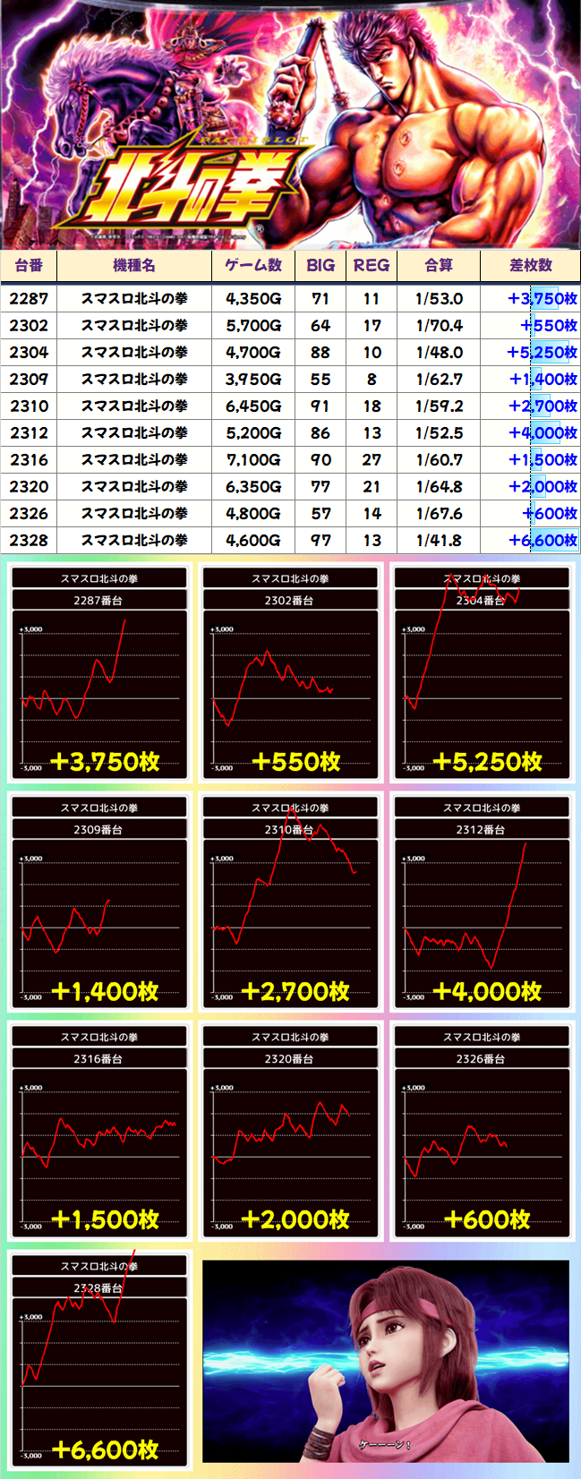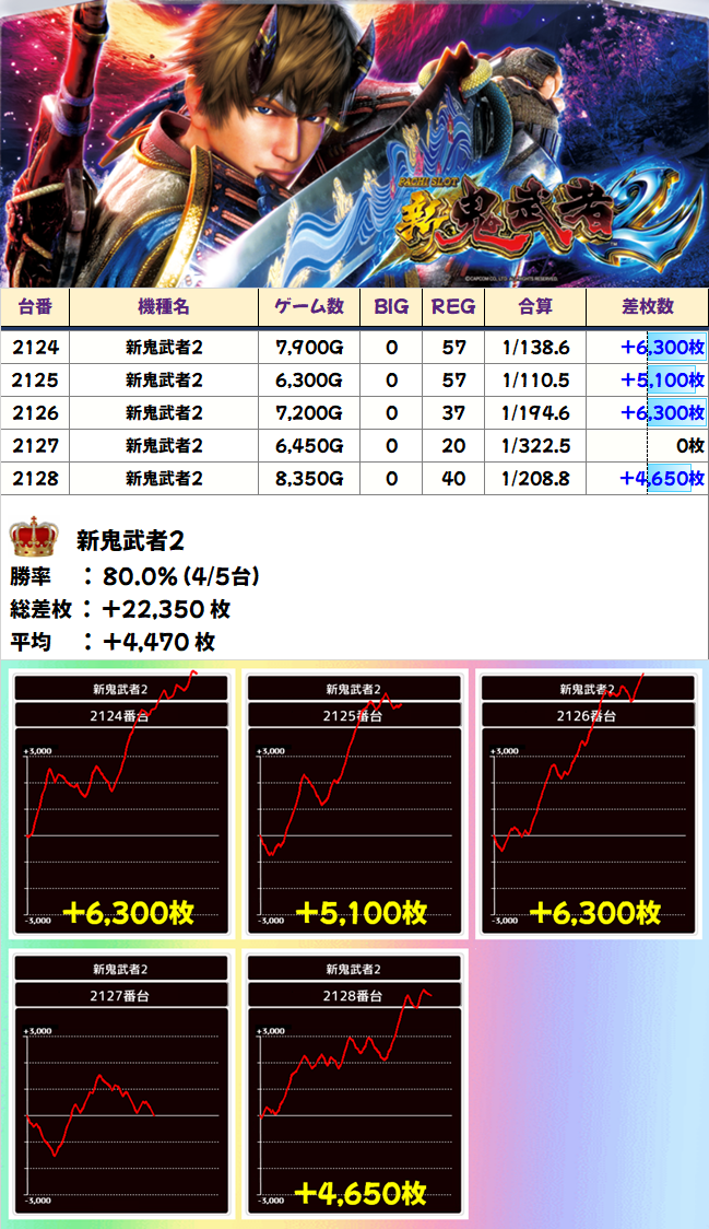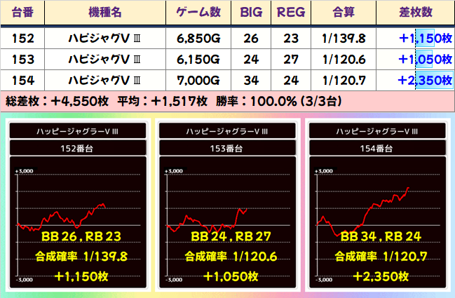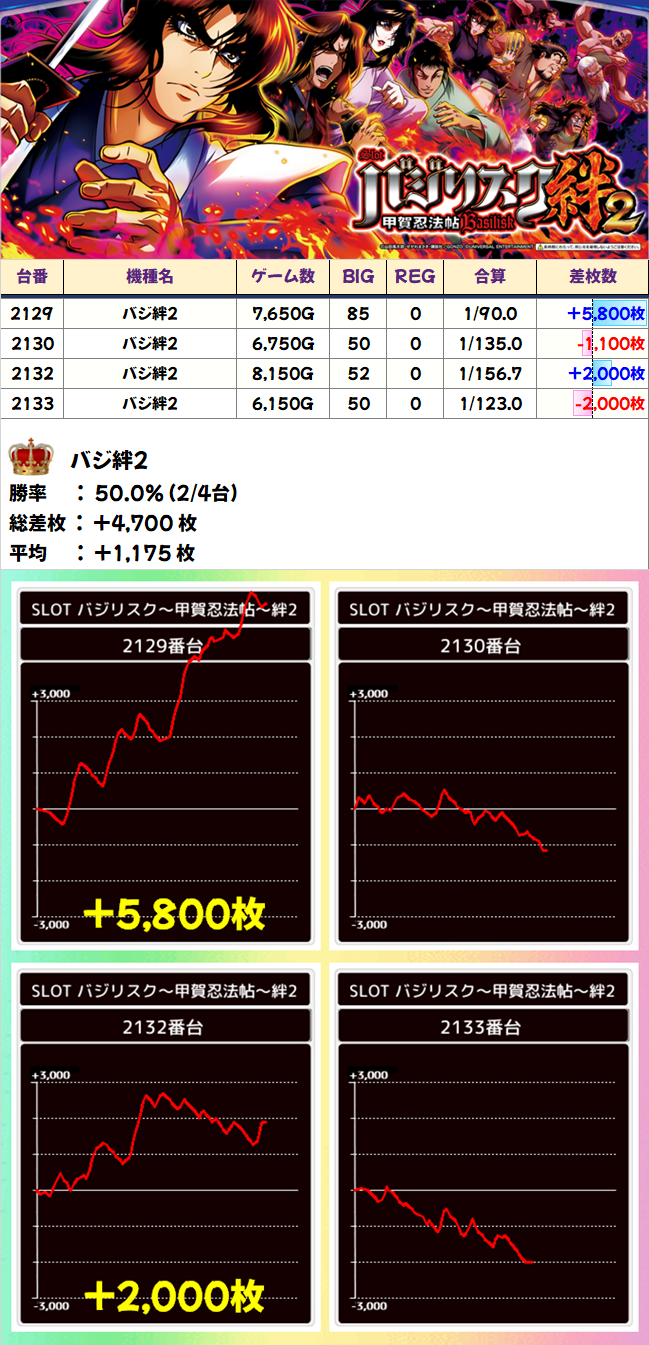 「番長ZERO」も全台系だったようです。2051番台からは+4000枚、2053番台からは+5450枚ととんでもない記録が飛び出し、平均差枚+3250枚の大勝利を納めました。