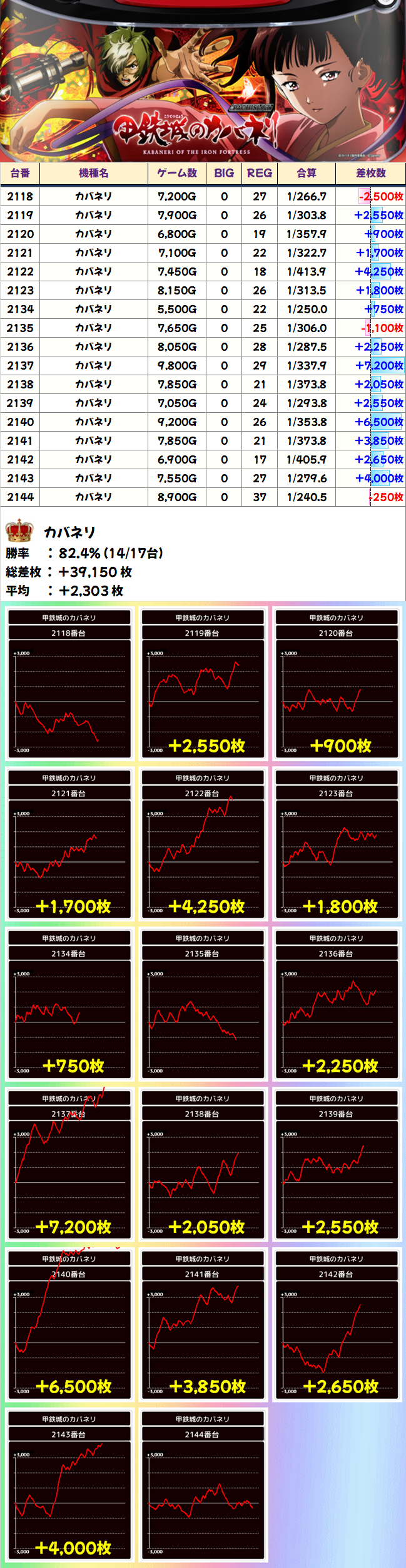 17台構成の「カバネリ」が圧巻の良挙動。まさかとは思って何度も見返しましたが、ほぼ間違いなく全台系でしょう。17台中14台がプラス、平均差枚は+2303枚と素晴らしい結果を叩き出しました!