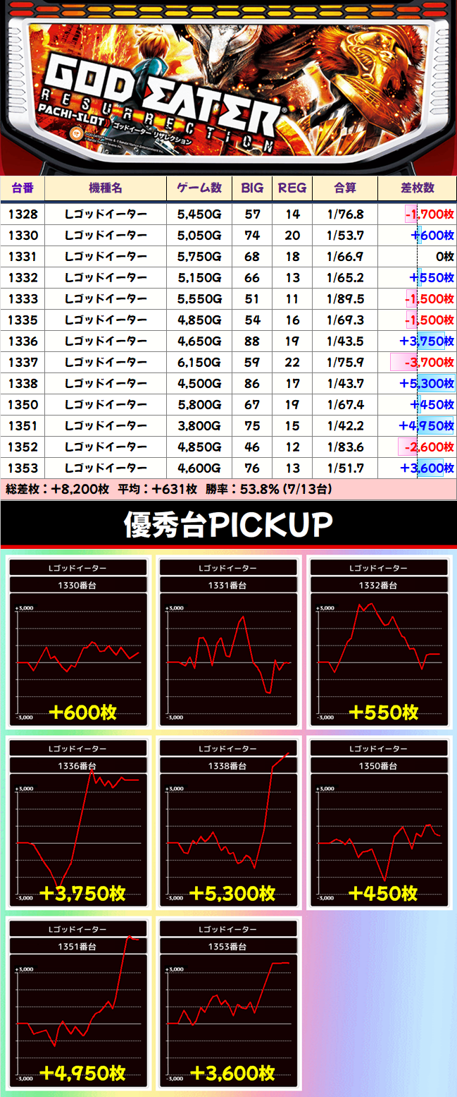 さらに、この日はでちゃう!一斉取材で山佐プレミアム(⑧の日)が絡むため、直近で増台されてるゴッドイーターと、定番機種のモンキーVが注目株と言えます。