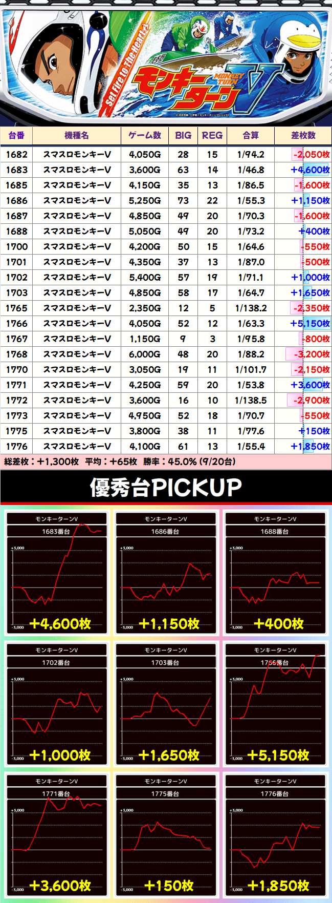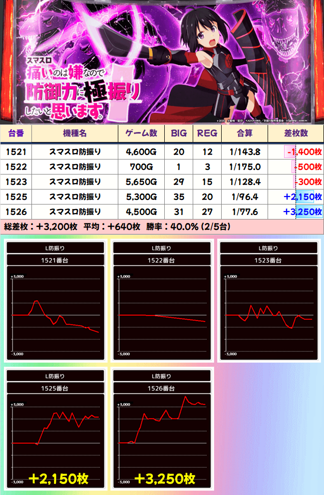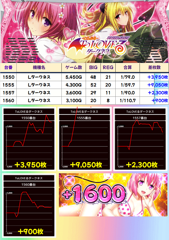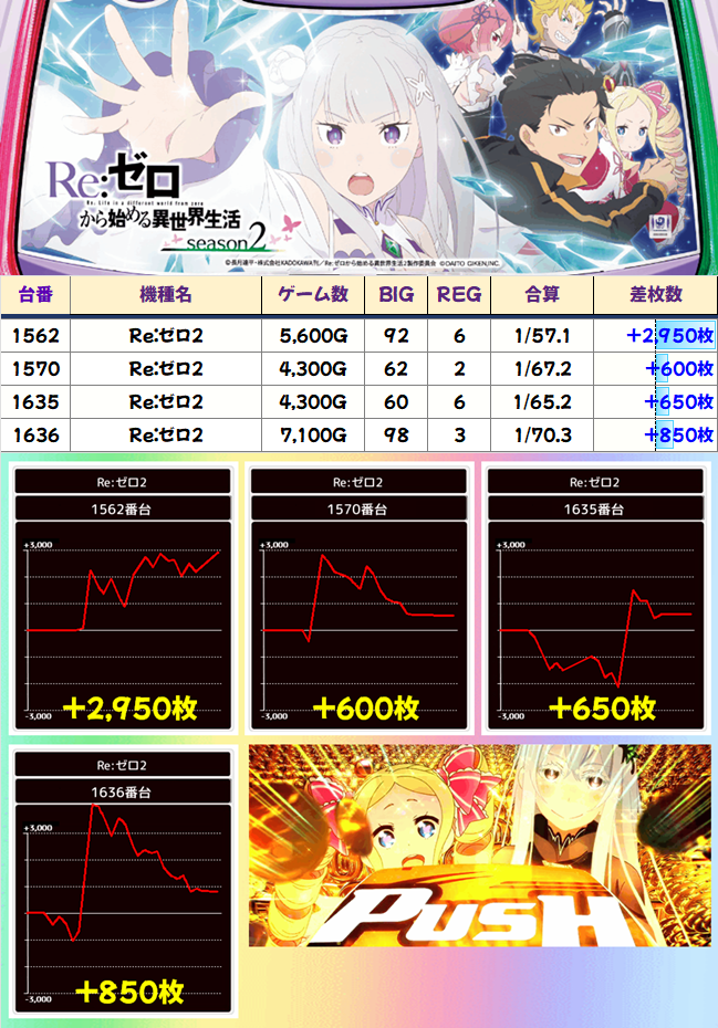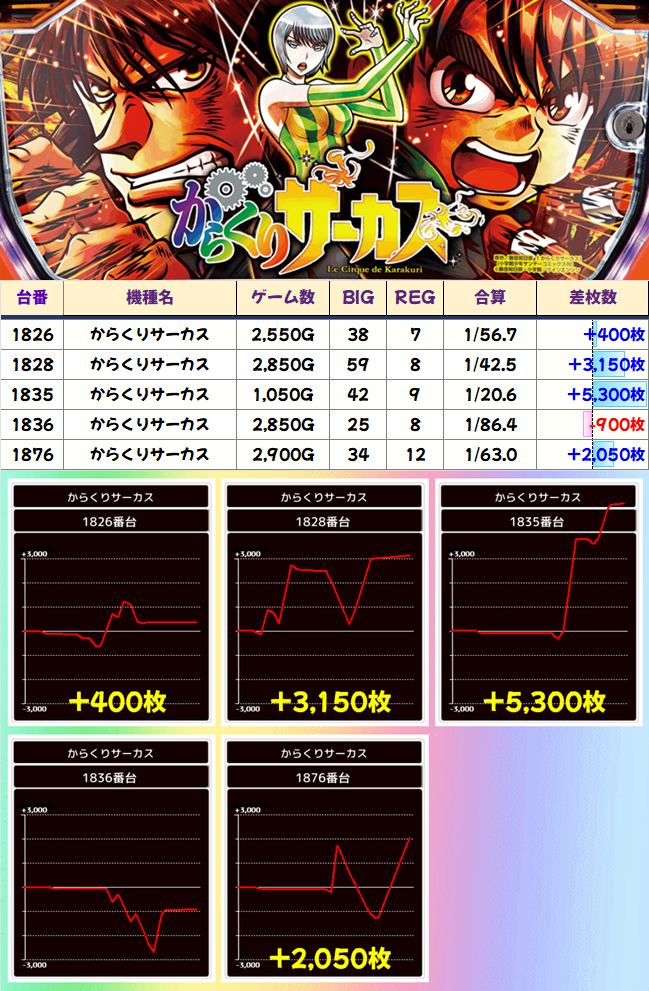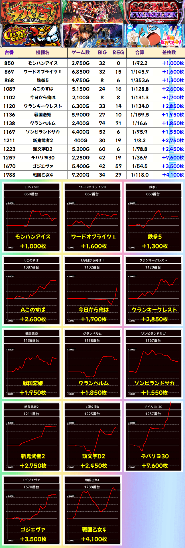 導入当初話題になったチバリヨ30が2作目を凌ぐ7000枚を達成。クレスト、Aこのすば、ワードラ2あたりは安定挙動が見られます。