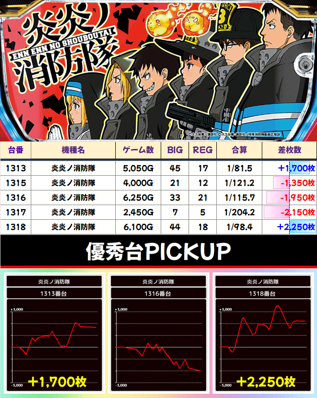 REG回数が3回の差でもBBの回数で天と地の結果にわかれたのが1313番台と1316番台。やはり炎炎激闘次第か…?