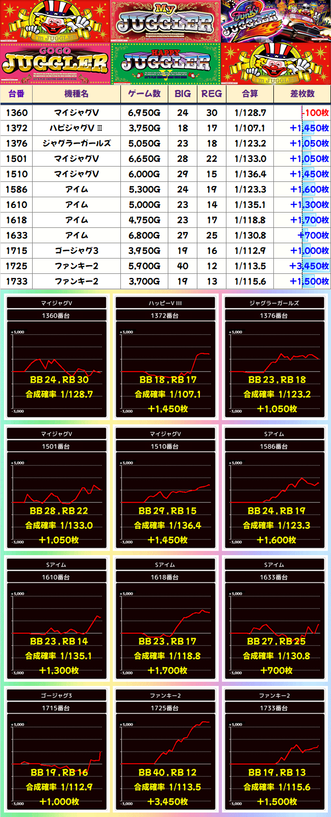 1台あたりの平均差枚でいえば、この日TOPの機種。AT当選率と異色ボーナスに差があり、あとは自力要素が強いので着火すると伸びます。