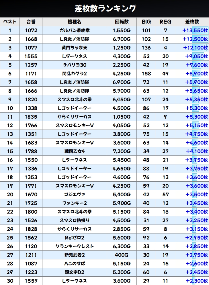 11/8の出玉ランキング30位まで