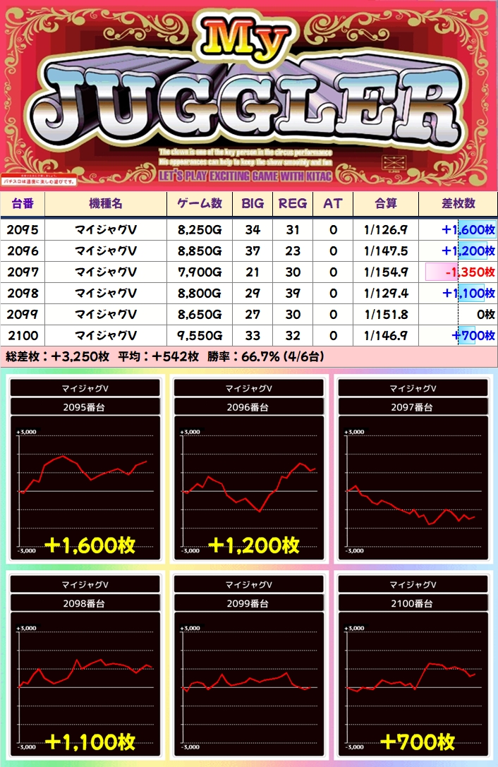 今回も並び仕掛けが複数用意されており、ジャグラーからは「マイジャグ」に6台並びを確認!
