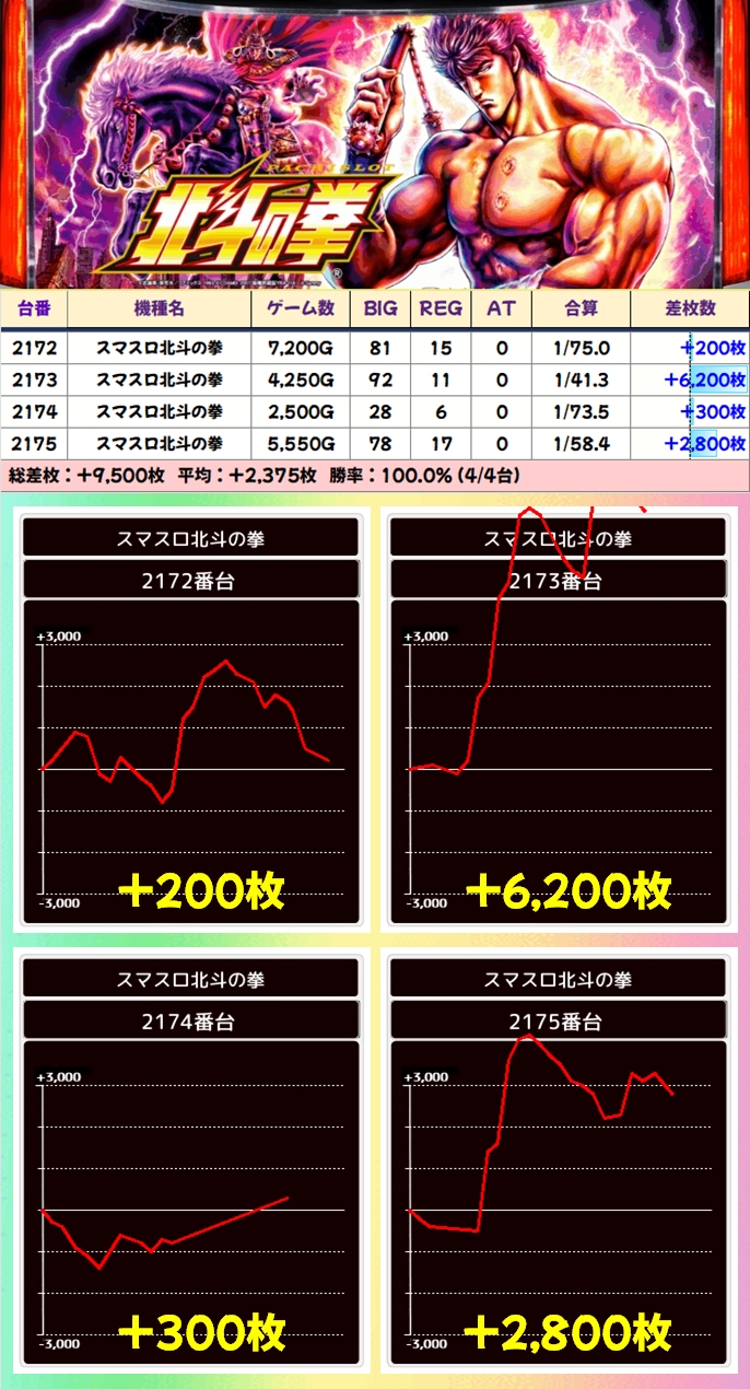 また、メイン機種の「スマスロ北斗」にも4台並びを2箇所確認でき、+6000枚オーバーの台が出現していました。