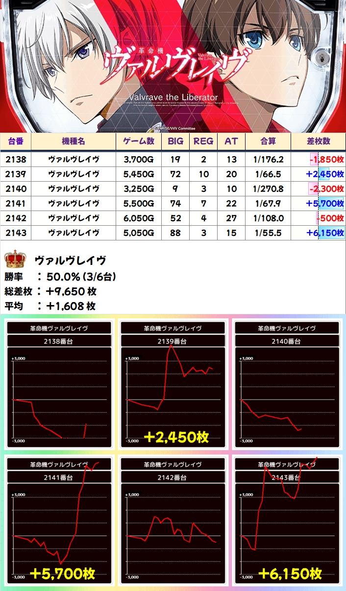 また、「ヴァルヴレイヴ」も高配分になっていたようで、+5000枚オーバーの台が複数出現していました。