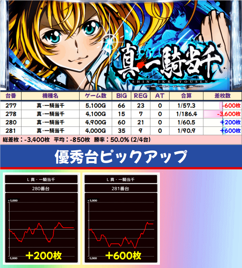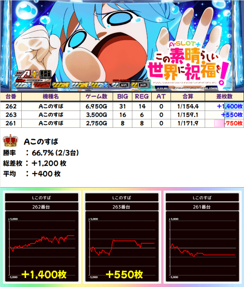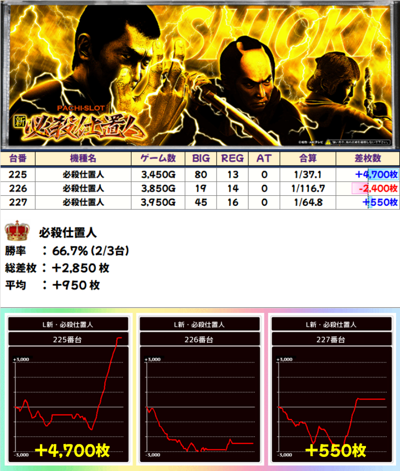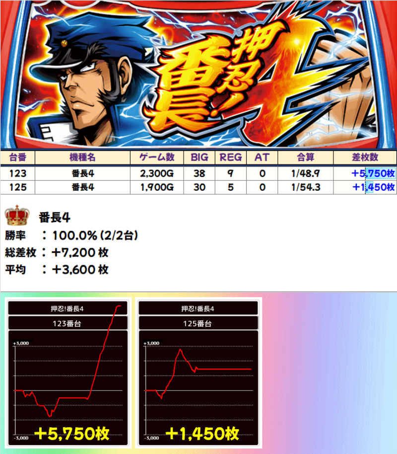 押忍!番長4、新・必殺仕置人、新ハナビ、Aこのすば、ハイパーラッシュは、ニブイチ以上の好結果で終わりました。各台の差枚でも、番長4の+5750枚、必殺仕置人の+4700枚など、好記録を出した台がありました。