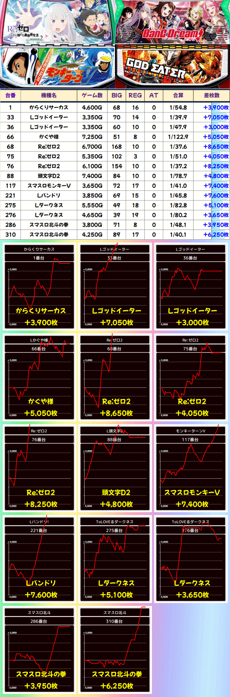この日の差枚数ランキングはこちら。+8650枚を獲得したRe:ゼロ2が1位でした。2位にもRe:ゼロ2が+8250枚でランクイン、+7600枚を獲得したLバンドリが3位でした。