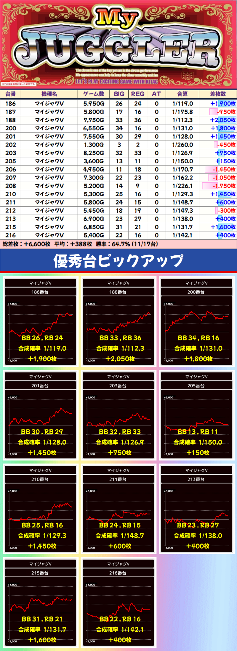 機種ごとに見ても、全台系濃厚だったハッピージャグラーをはじめ、マイジャグラーⅤ、ゴーゴージャグラー3、ジャグラーガールズが、ニブイチ以上の好結果をあげています!