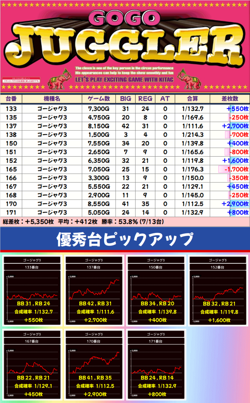 ジャグラーコーナーは、全体的に高ベースでした。51台中31台がプラス差枚で勝率54.4%を記録!総差枚でもプラスを記録しています!