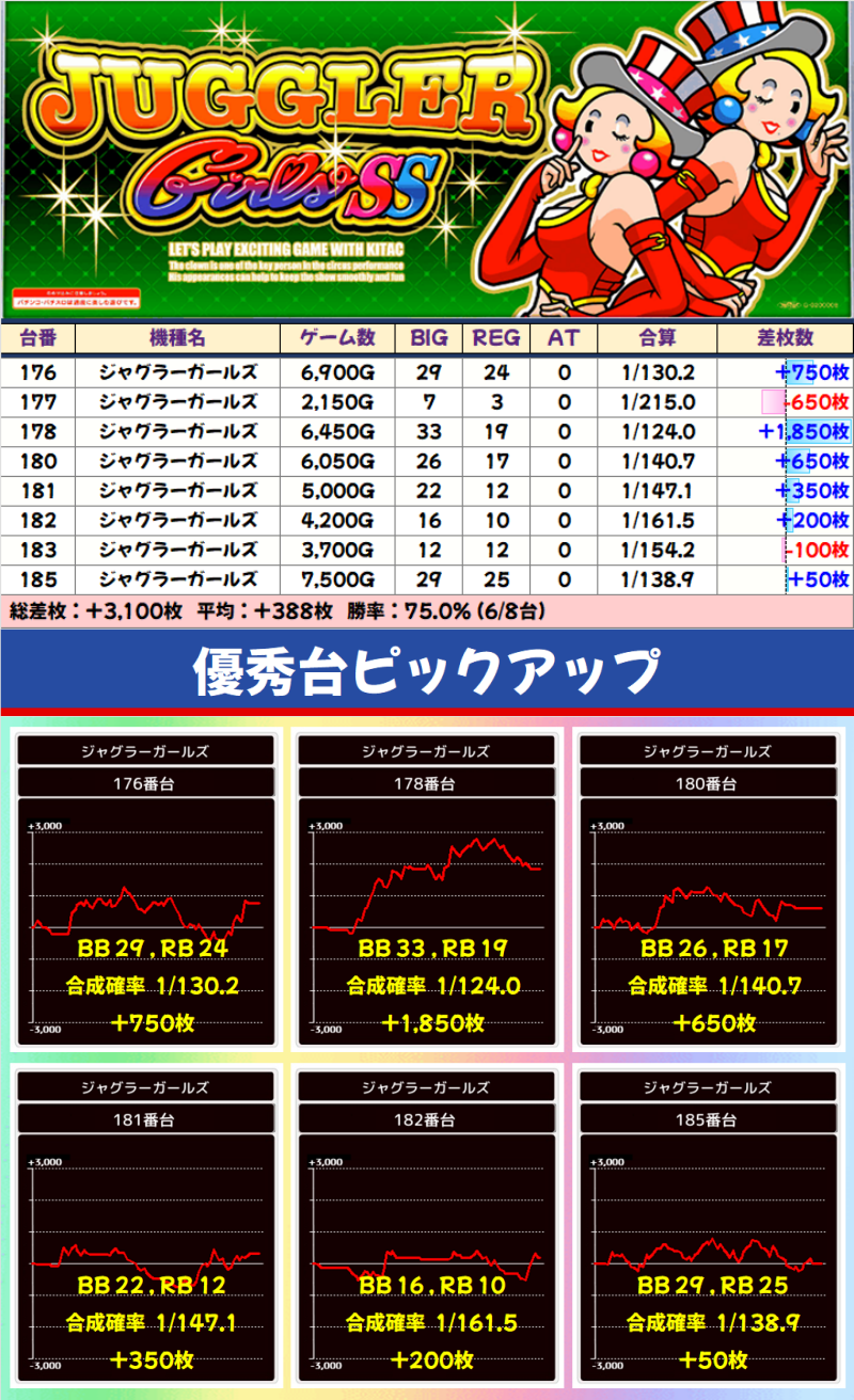 【高配分】ジャグラーガールズ(6/8台)|平均+388枚