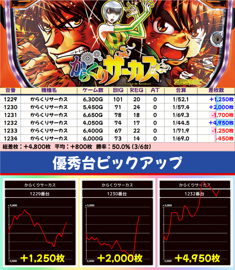 バラエティコーナーからは、真・一騎当千が+11150枚という高水準な記録を出した台がありました。その他にも、プラス千枚以上をたたき出した台が数多くありました。