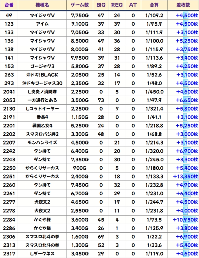 ドーナツ関連からハピジャグとミスタージャグが優秀であると判断しましたが、出玉としては不発気味に。ただ稼働はしっかりと伴っているので、打ち手は察していた可能性あり!