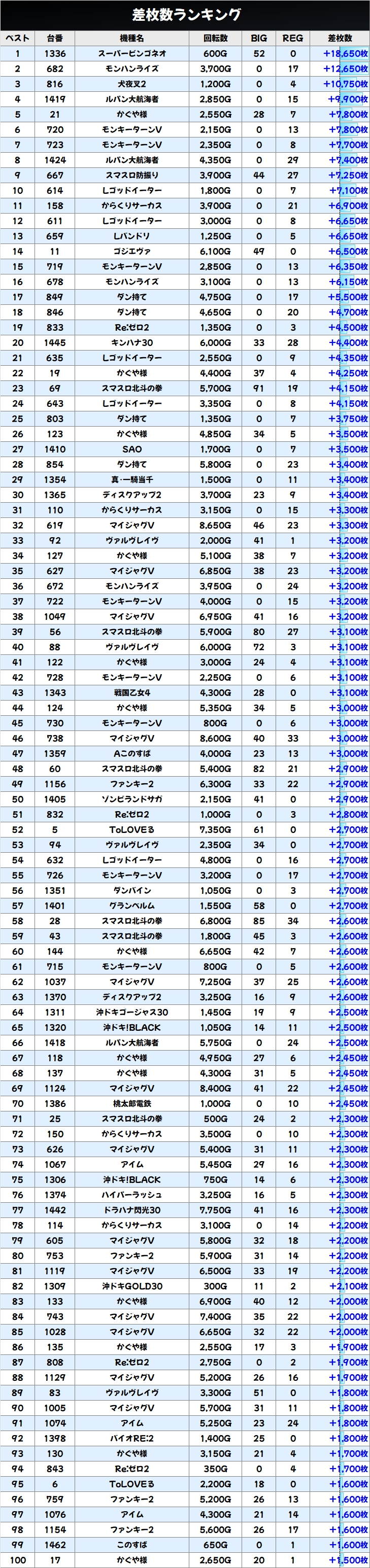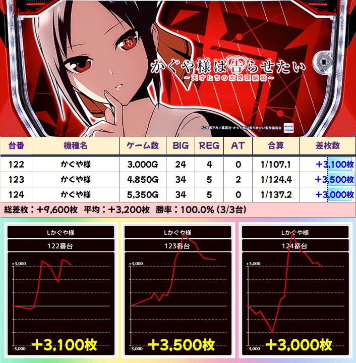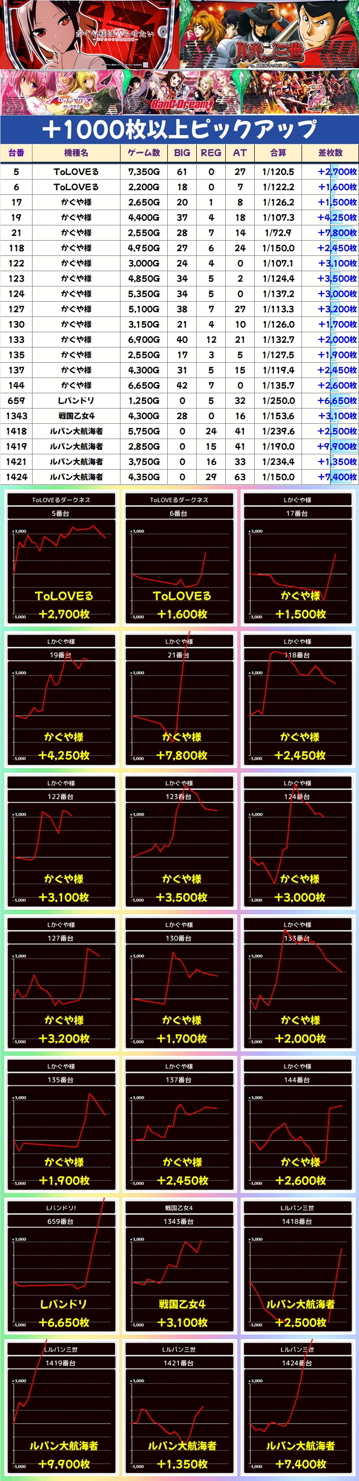 狙い目機種の中でも多台数設置の「かぐや様」にはお宝台が多めに投入されていたようで、+1000枚以上の台が多数出現!