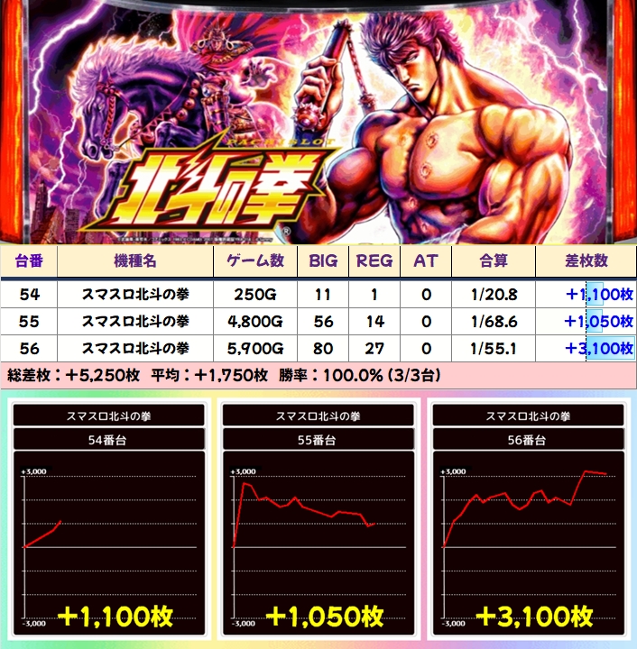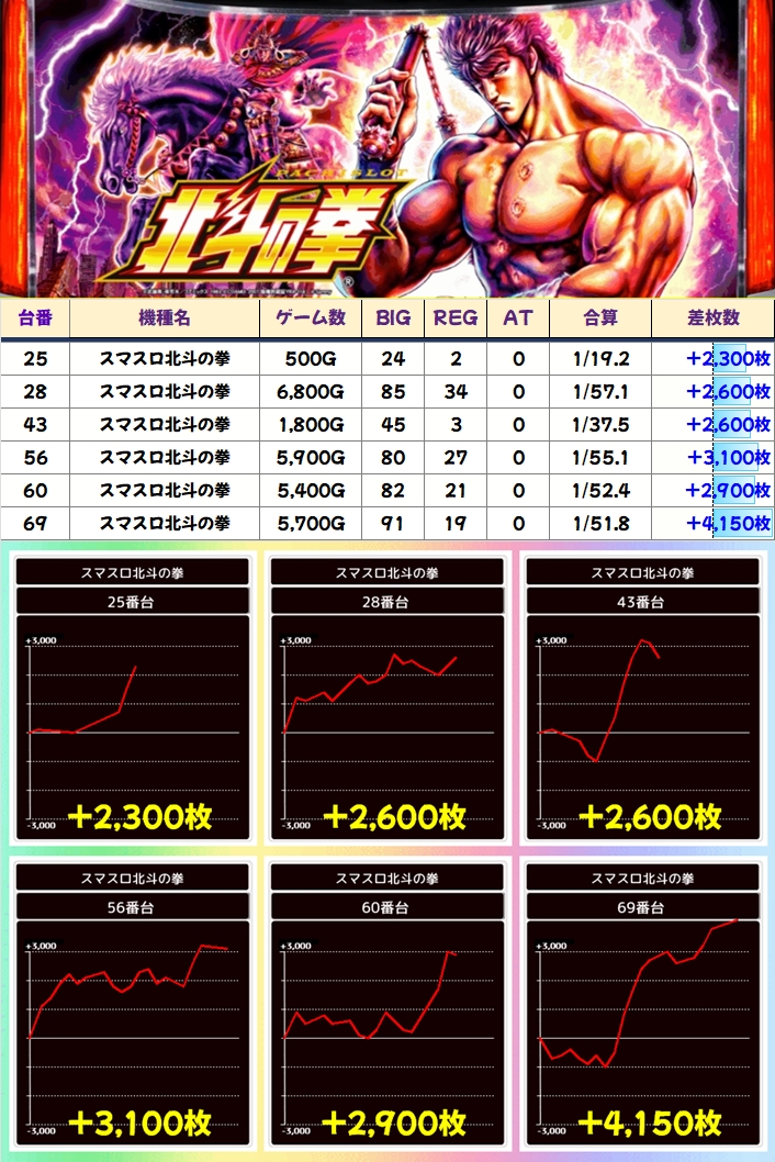 並び仕掛けがあった「スマスロ北斗の拳」は、+4000枚オーバーや+3000枚オーバーの台を複数確認できました!