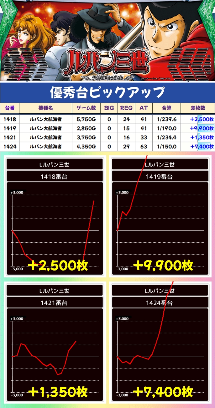今回もポスター機種の一つだった「ルパン大航海者」が高配分になっており、7台中4台が+1000枚以上と1/2系濃厚の結果に!
