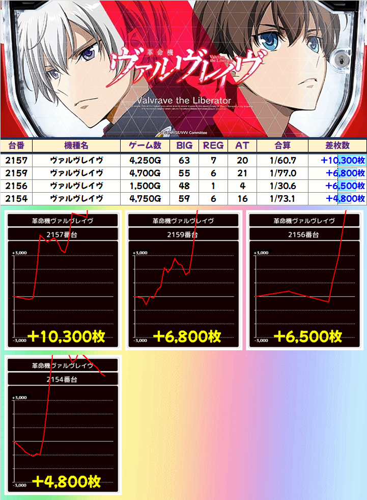 スマスロからは、万枚を筆頭に4台が+4000枚以上の「ヴァルヴレイヴ」、列仕掛けもあった「北斗の拳」、+7350枚を筆頭に3台が+4000枚以上の「Lゴッドイーター」が対象に!