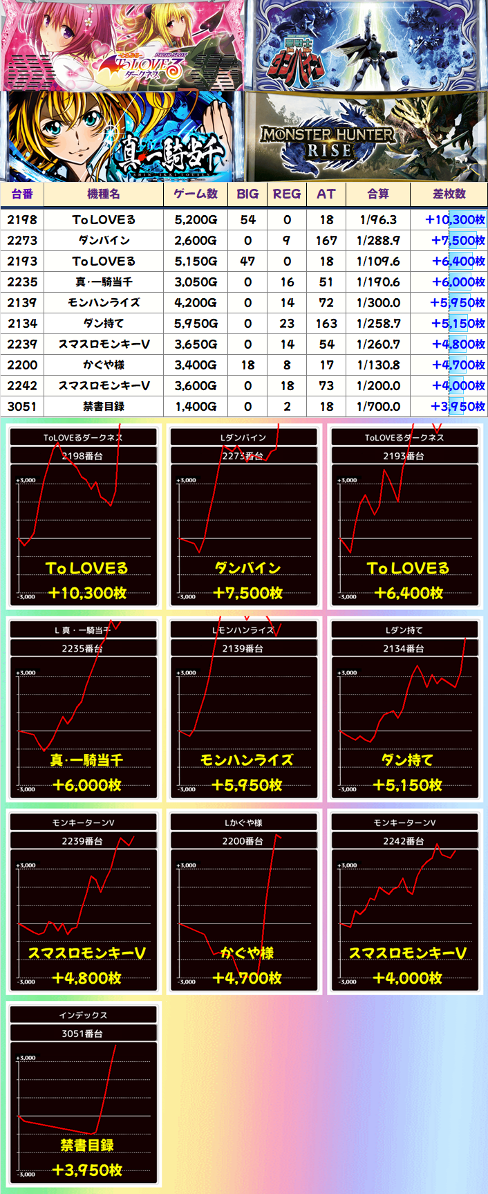 仕掛け箇所以外にも「To LOVEる」の万枚&+6400枚、「ダンバイン」の+7500枚など単品優秀台が大量に!非常に充実していました!