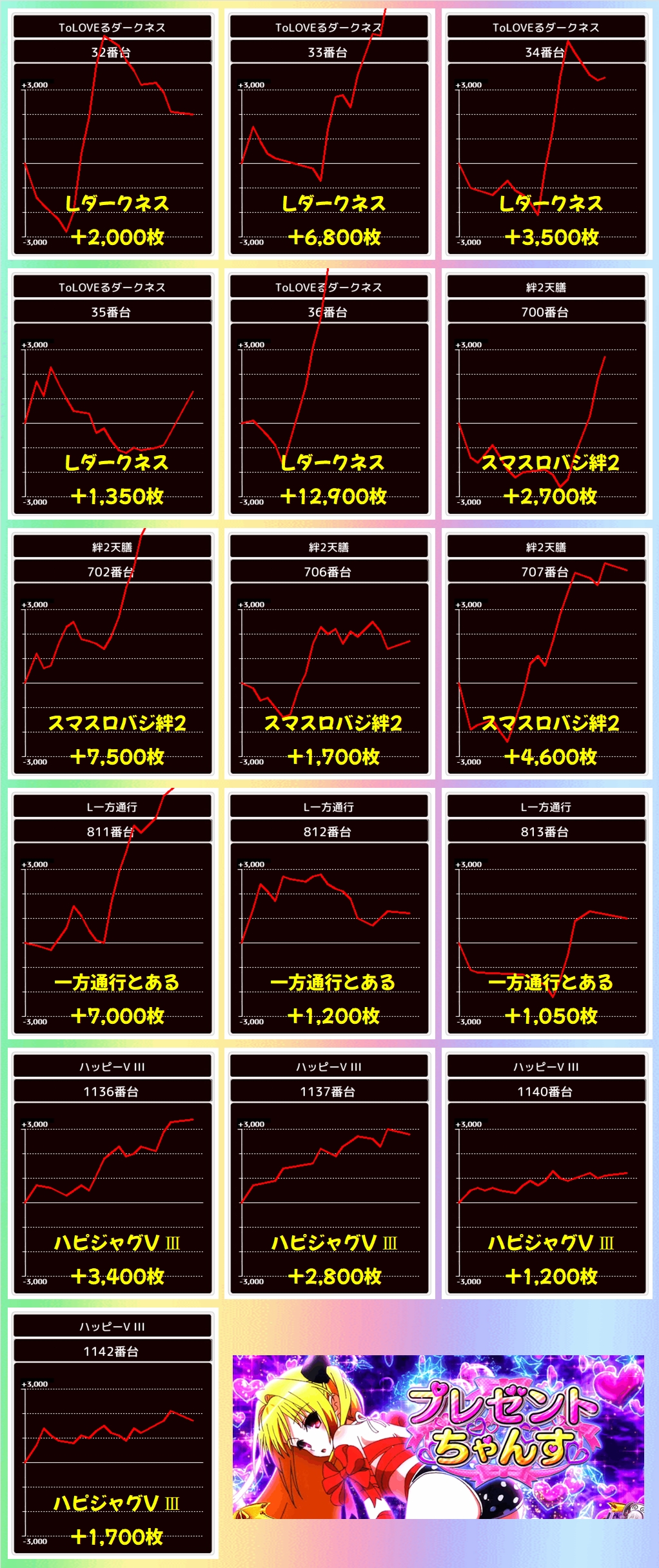 いずれの機種もトータルでもしっかりプラスとなっており、見せ場を作っておりました。スマスロはToLOVEるが万枚超で、天膳&一方通行は+7000枚超!ハピジャグも4台が+1000枚超で平均約1000枚のプラスに!