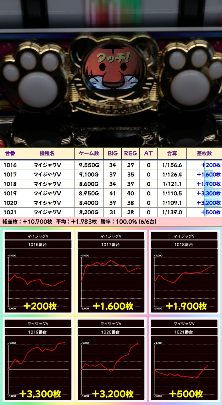 今回はゴッドイーター以外に並びの仕掛けがありましたが、それらも含めて改めて優秀台をピックアップします。まずは台数が多いマイジャグVから確認しましょう!
