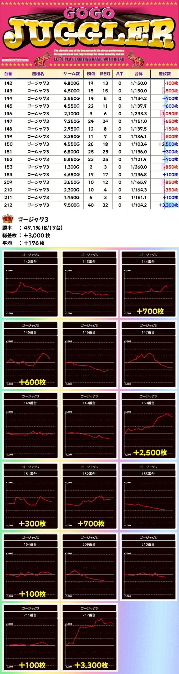 今回もジャグやもともと強かったスマスロを中心に複数の仕掛けを確認でき、総差枚は+8万枚超!