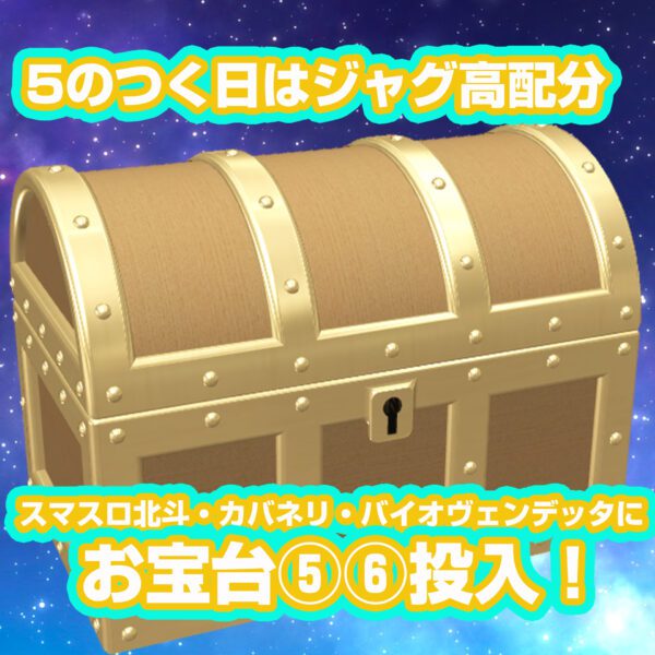 ジャグV・アイムには複数投入されていて、出玉的にも元気であったし、全体的には良い結果だったといえるだろう。スマスロも魅力的な出玉をあちらこちらで確認。スマスロ北斗・カバネリ・Lバイオという人気機種に⑤⑥を投入とは嬉しい限り!。他のジャグにも複数投入の可能性もアリ、次回以降も5のつく日はジャグを積極的に狙っていこう! もちろん続々導入されるスマスロも狙うのはありだ!