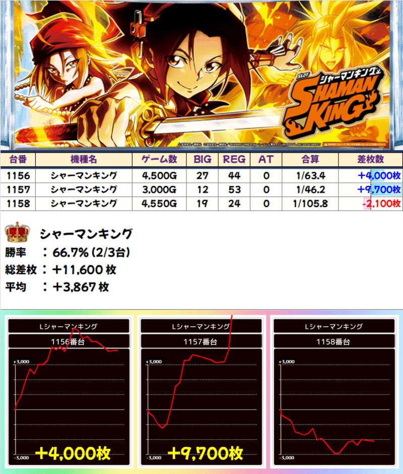 シャーマンキングは、+9700枚の台を筆頭に設置3台中2台がプラス差枚で、機種平均+3867枚という結果でした。