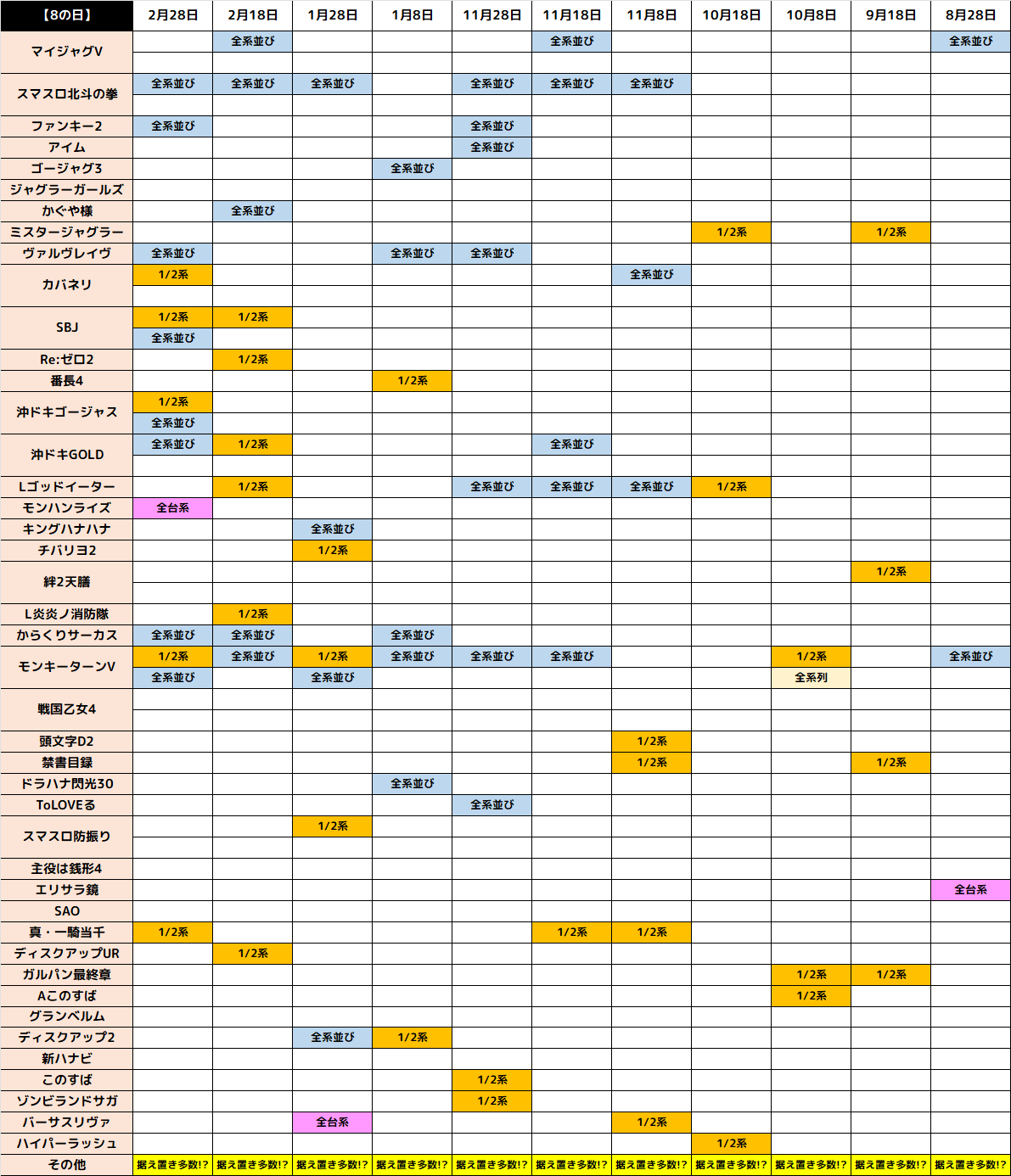 8のつく日は山佐機種がチャンスとなるのはもちろんですが、下記の過去の仕掛けを見れば分かる通り、幅広い機種から様々な仕掛けを確認できております。今回はどんな仕掛けがあったのでしょうか。