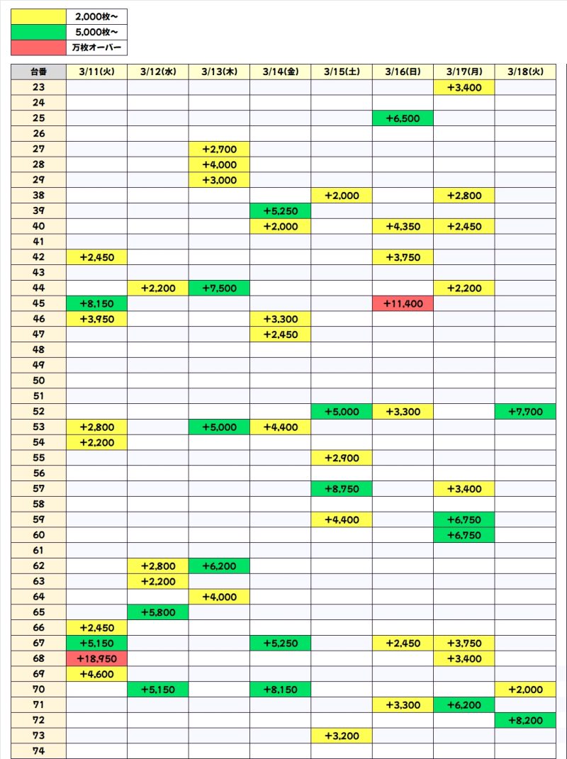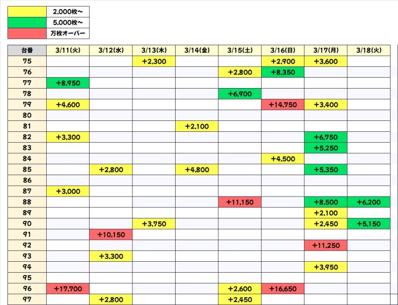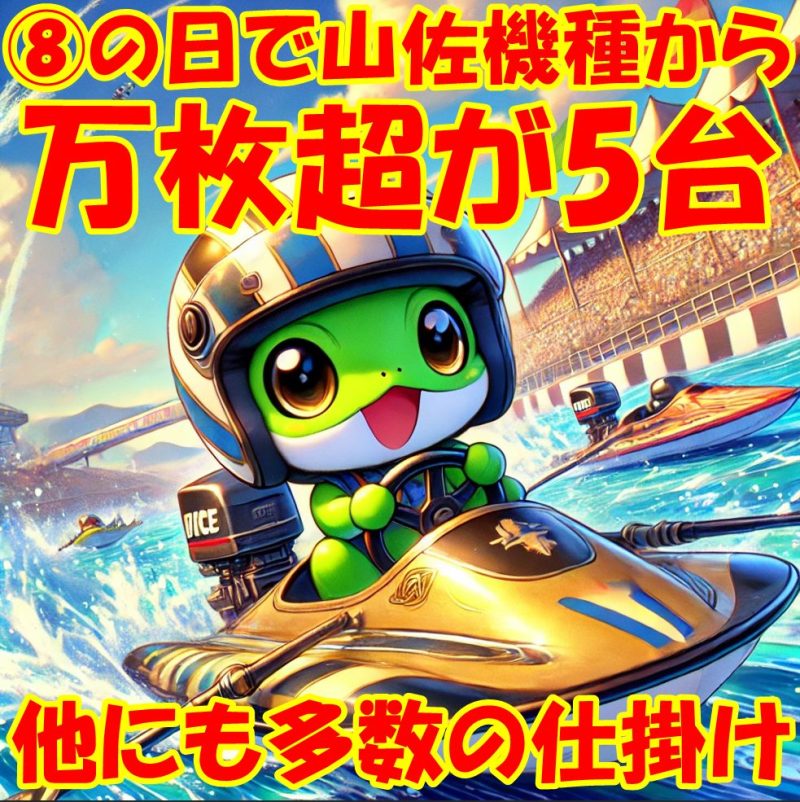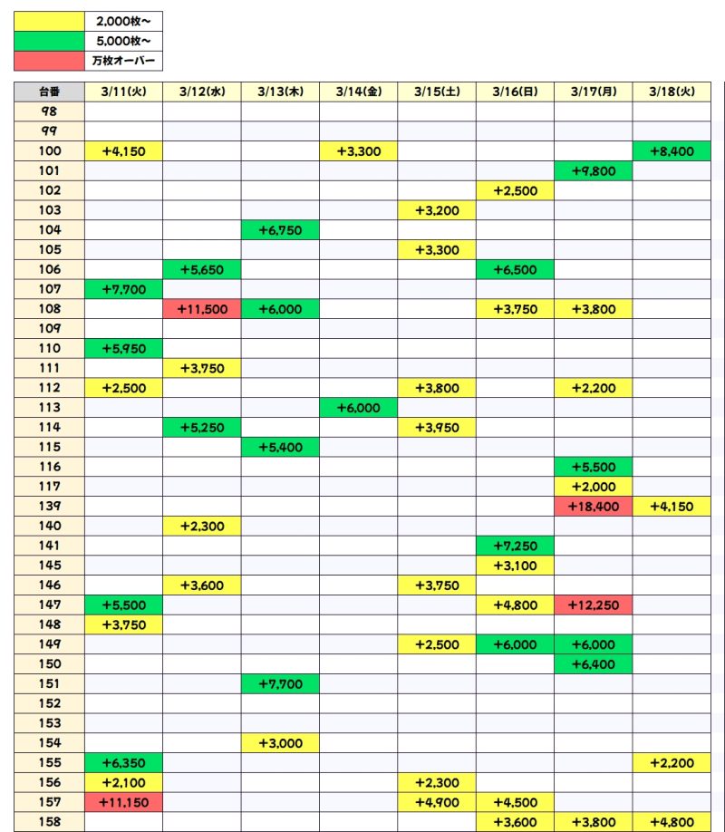 この日は山佐機種から万枚オーバーが5台と⑧のつく日ならではといった結果になったのではないでしょうか。また、山佐機種以外からも3台の万枚オーバーが出現し、万枚オーバーは合計8台も!