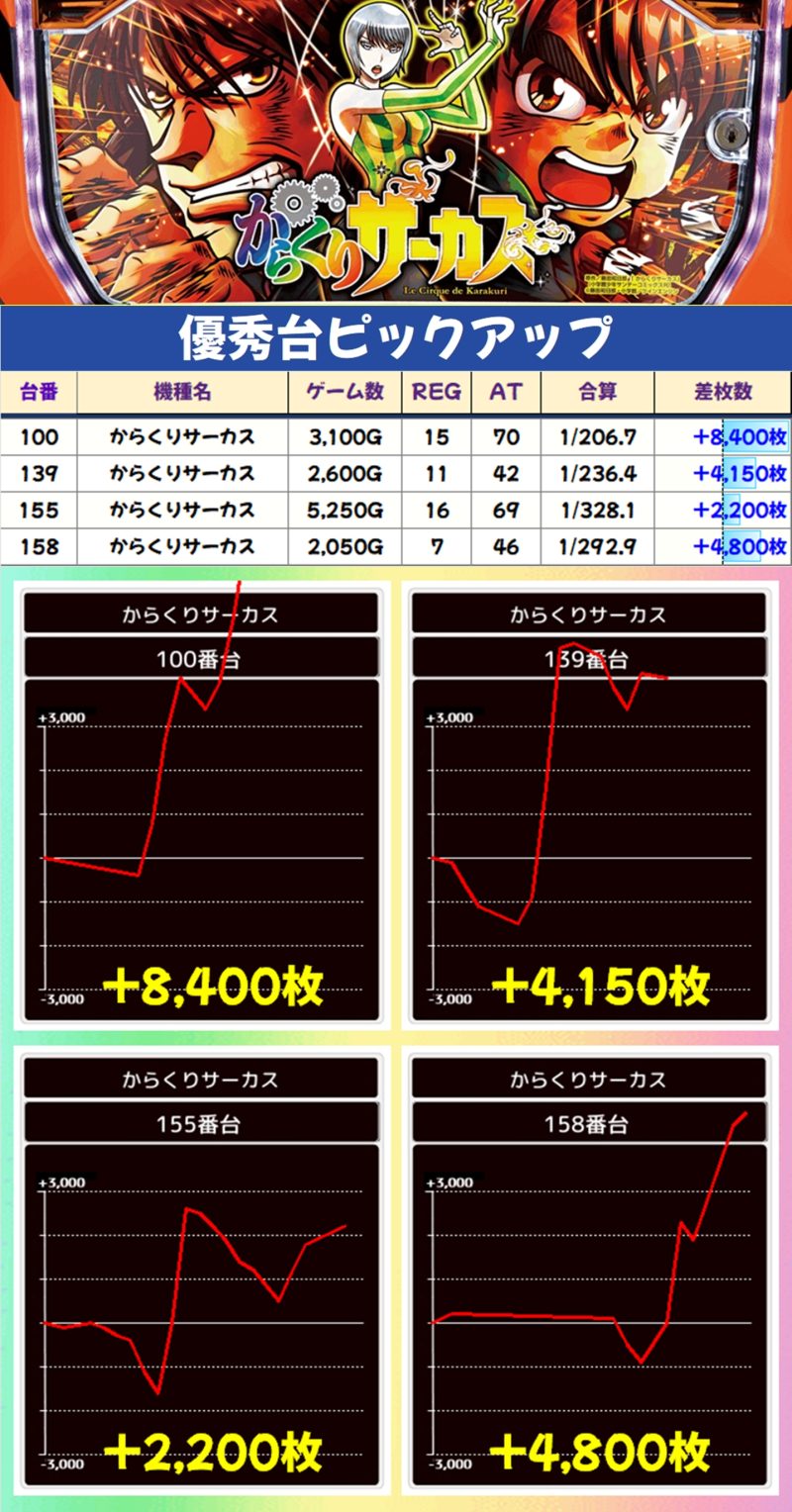 からくりサーカスからも+8400枚の見事な出玉が!その他にも+4000枚オーバーが2台出現しました!