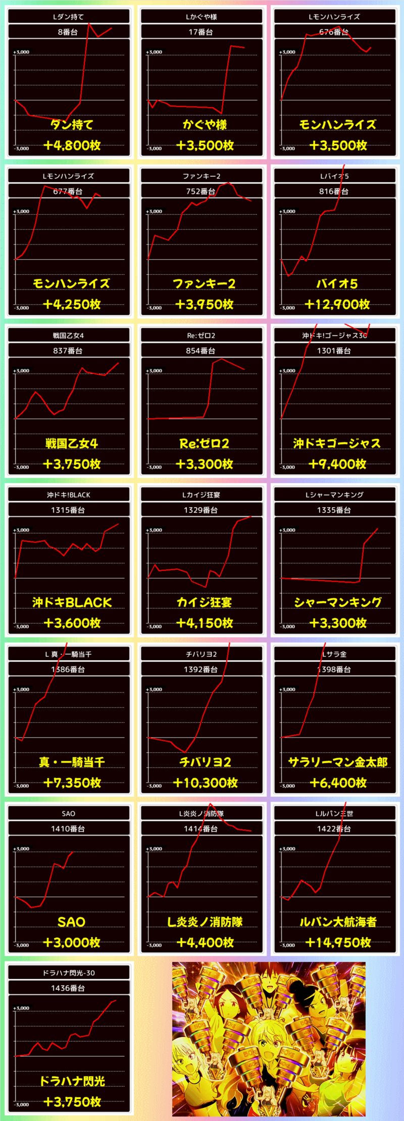 並びの仕掛けは3台並びが4か所の合計12台ありましたが、全台がプラスで大量出玉も多数という素晴らしい結果になりましたね!