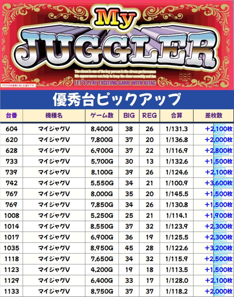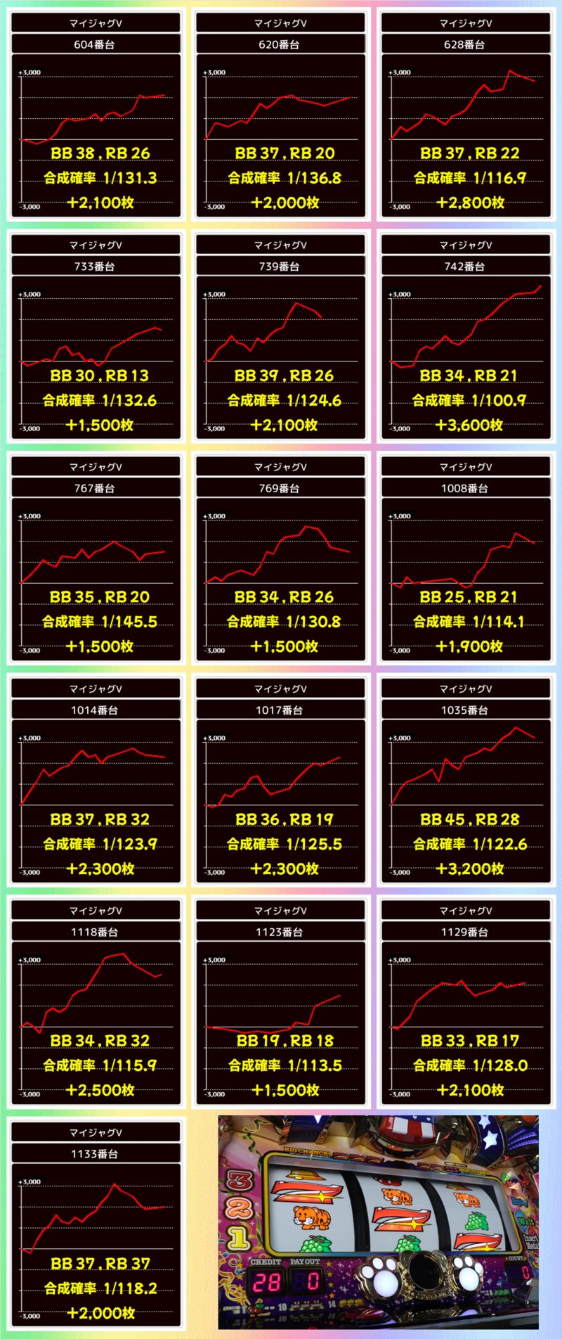 マイジャグVは設置設置台数が多いだけあって、お宝台も多数出現。+3600枚を筆頭に+2000枚以上の出玉が多数出現しておりました!