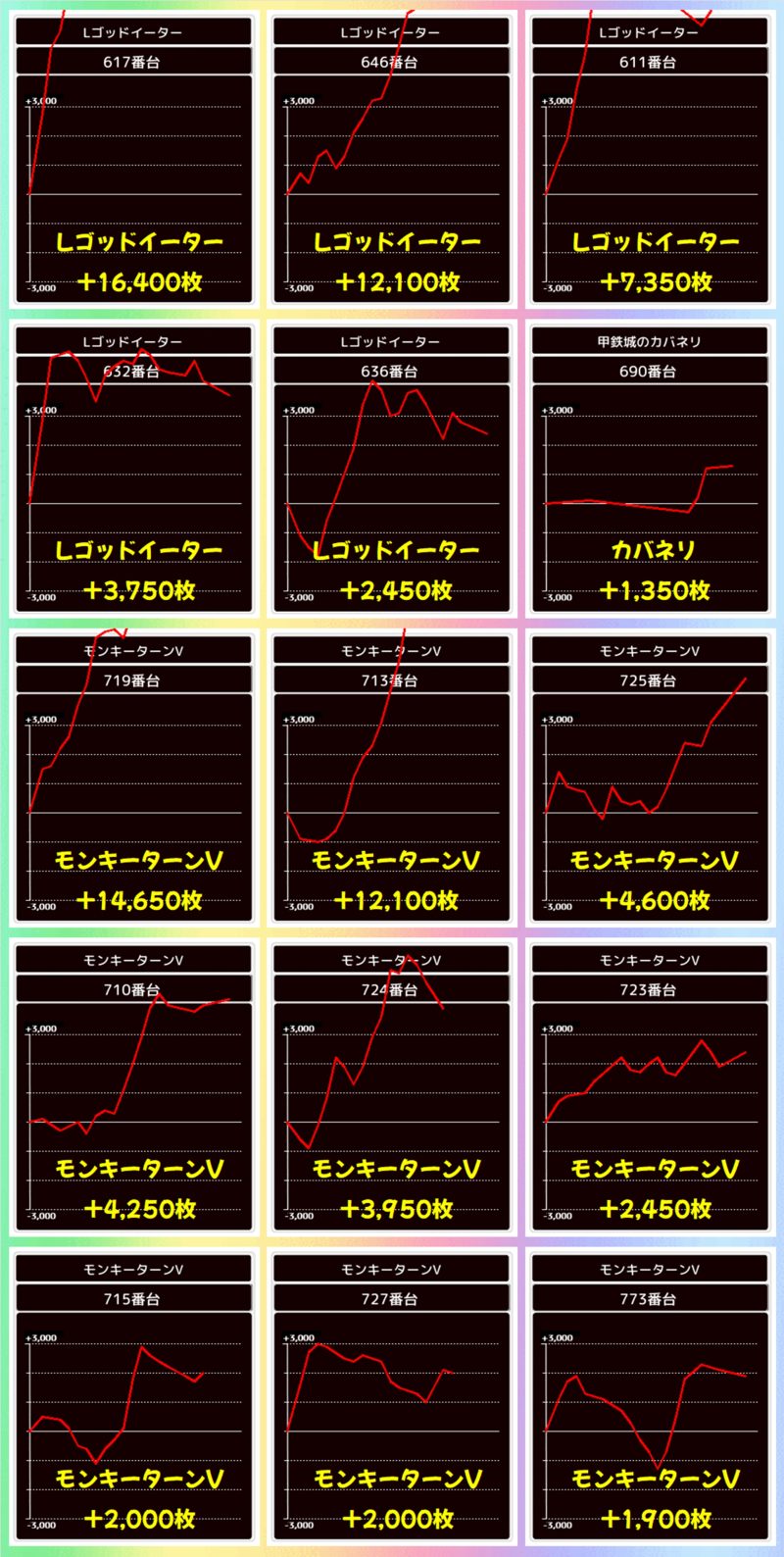 さすが山佐機種がチャンスの⑧のつく日というべきか、万枚オーバーの大爆発がLゴッドイーターから2台、モンキーターンVから2台出現。他にも大量出玉が多数あり、毎日カブくぜ機種でもある山佐機種は見事な結果を見せてくれましたね!