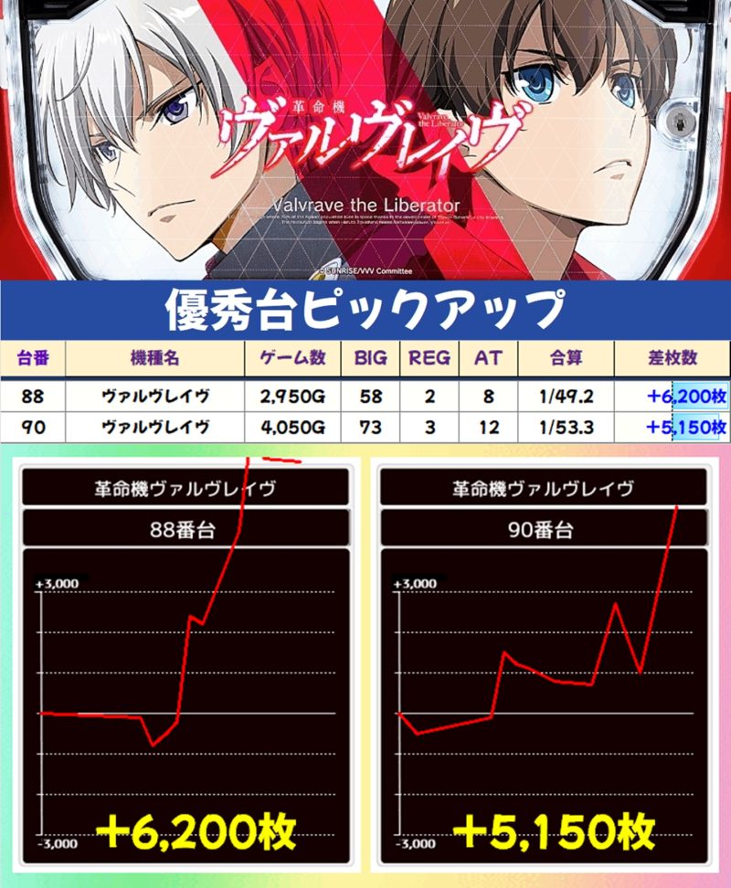 ヴァルヴレイヴは不発の台もありましたが、+6200枚、+5150枚と+5000枚オーバーの爆裂が2台アリ!