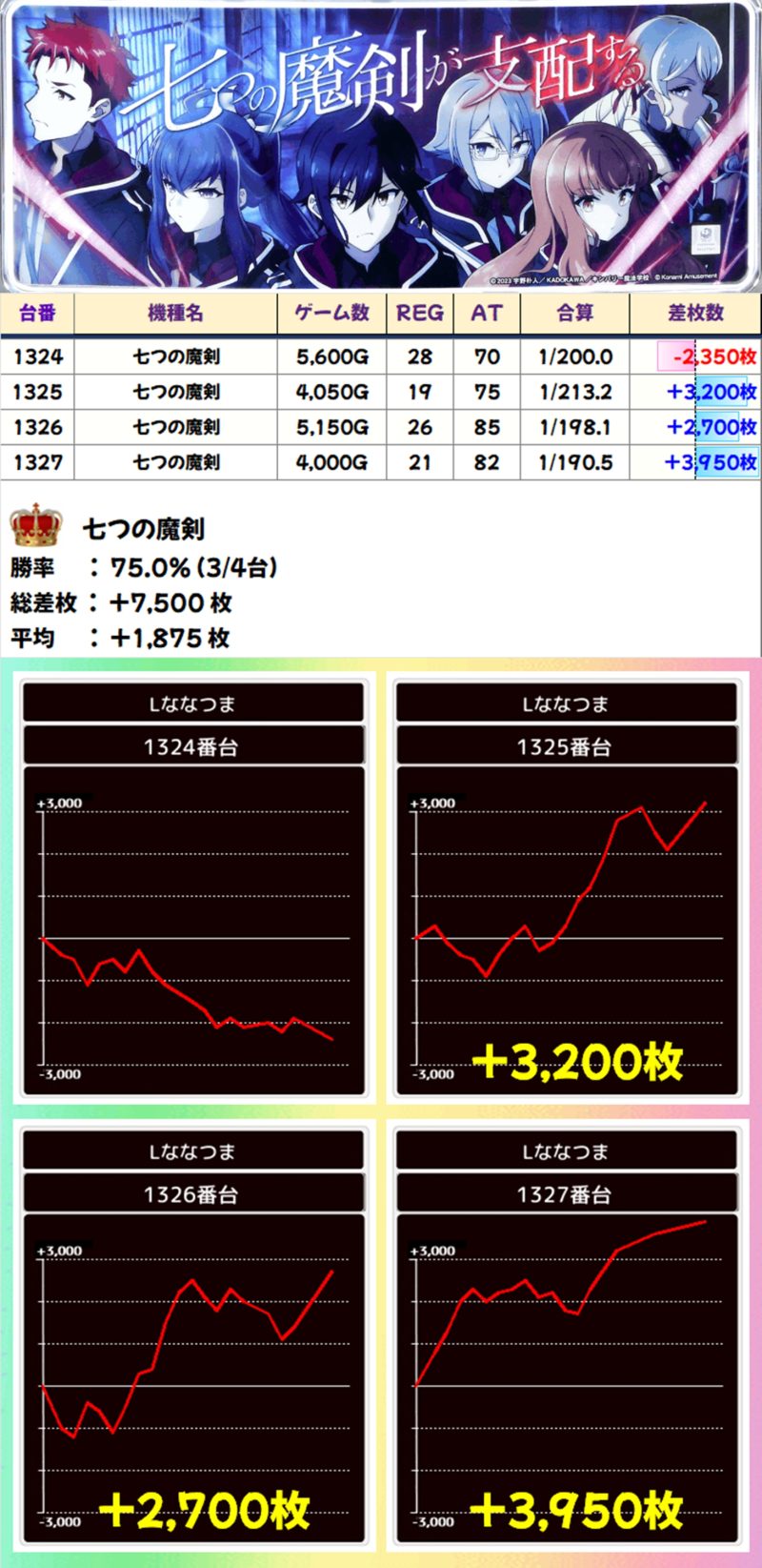 かぶぱポストにヒントがあった七つの魔剣は4台中3台がプラスに。残念ながら1台がマイナスとなってしまいましたが、プラスとなった3台はいずれも優秀な出玉を獲得!平均では+1875枚の好結果となりました!