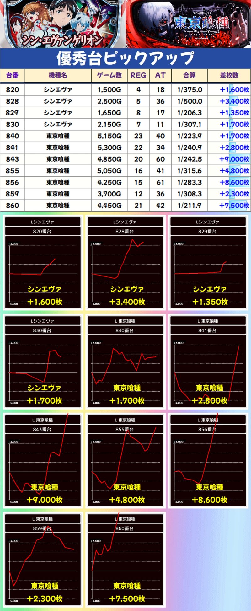 東京喰種とシンエヴァは高配分濃厚で、東京喰種からは+9000枚や+8600枚の大爆発台も出現。シンエヴァからも+3400枚などのお宝台を確認できました!