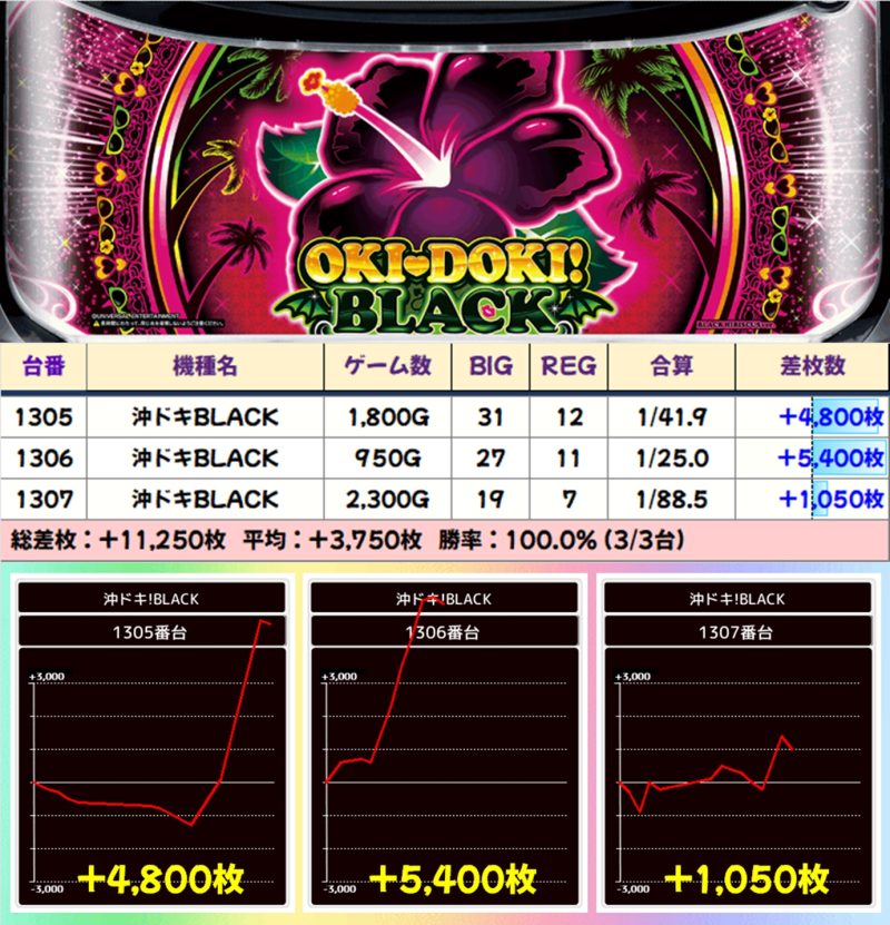 【3台並び】沖ドキBLACK(1305-1307番台)⏩Ave+3,750枚