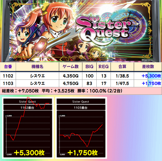 かなりの荒波機種として暴れているシスクエ。1102番台のように跳ねる展開を待つ台ですが、どちらの台もハマリは比較的浅めにみえます。