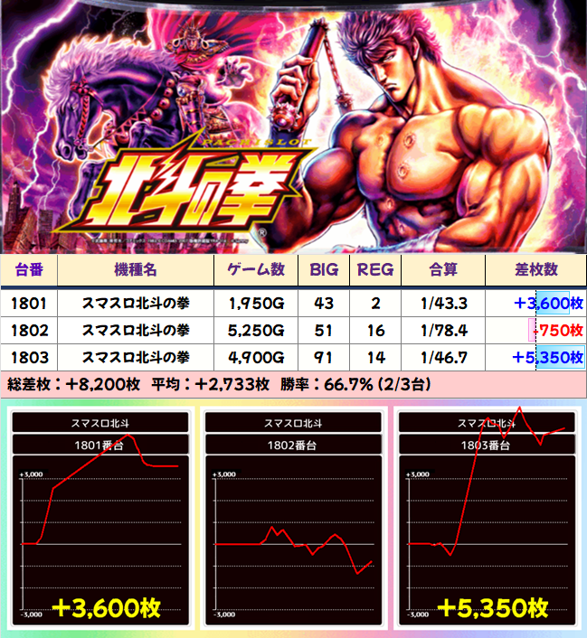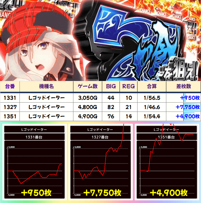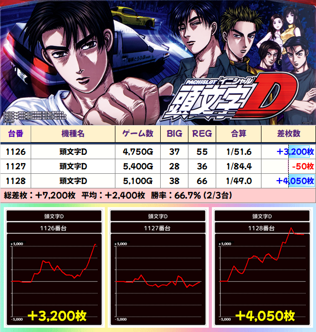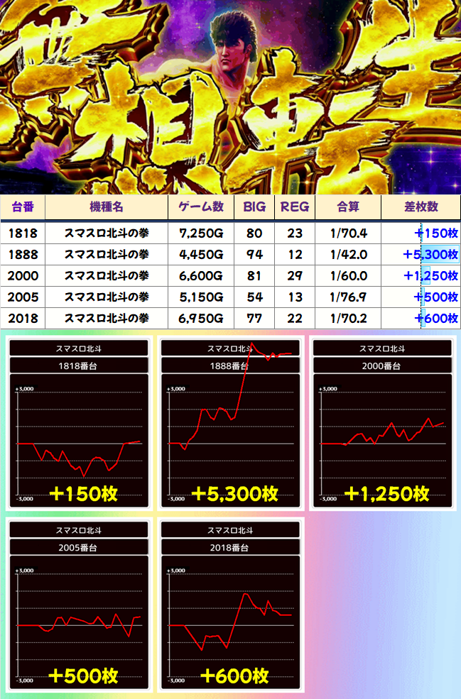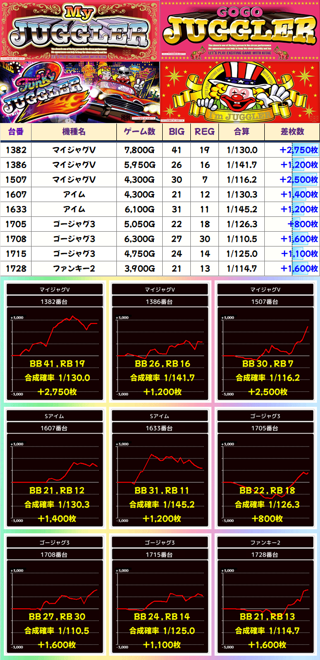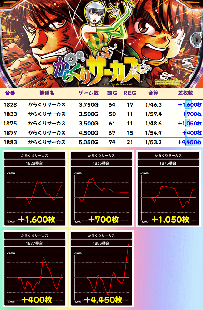 序盤の一撃で勝負を決めた台もあれば山あり谷ありの展開の台もあり。