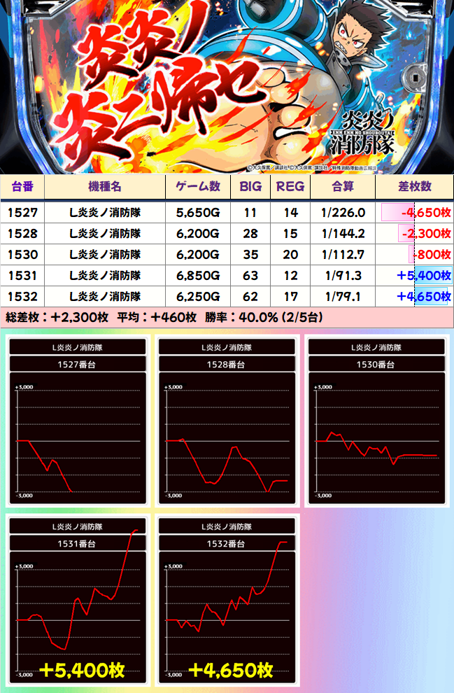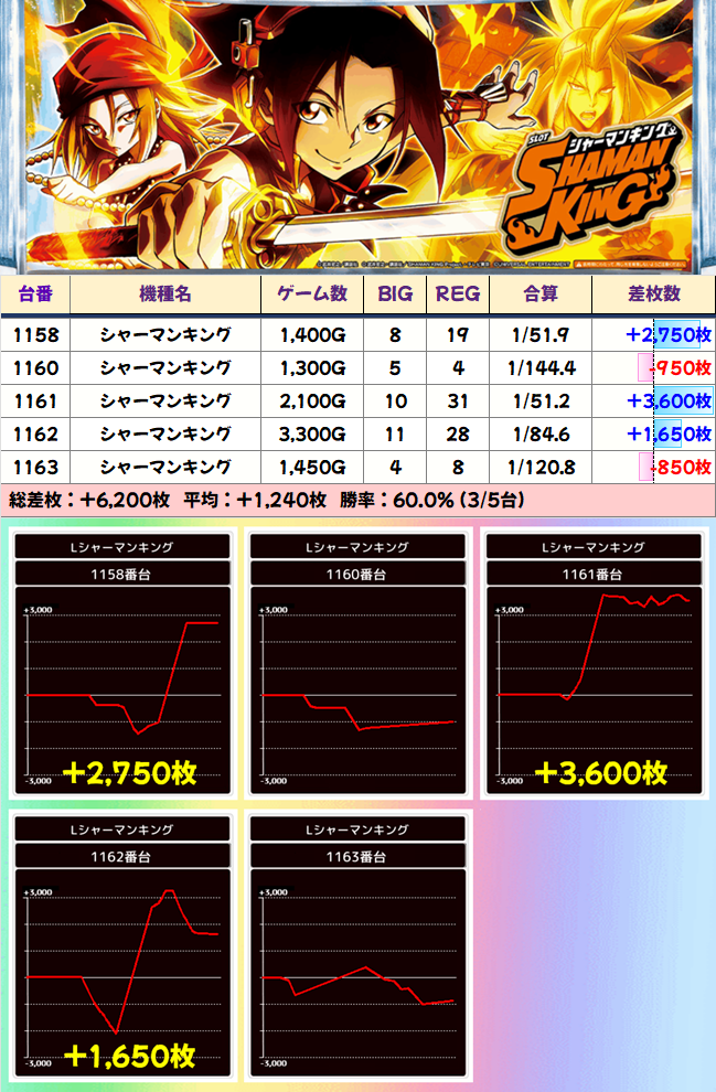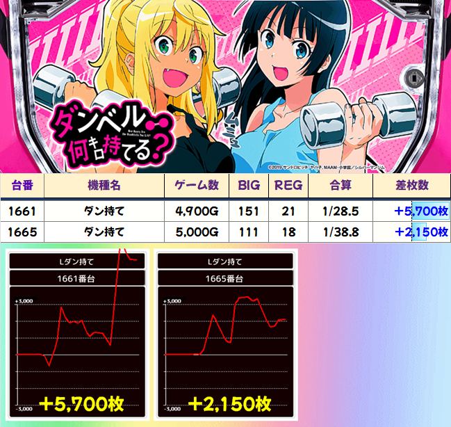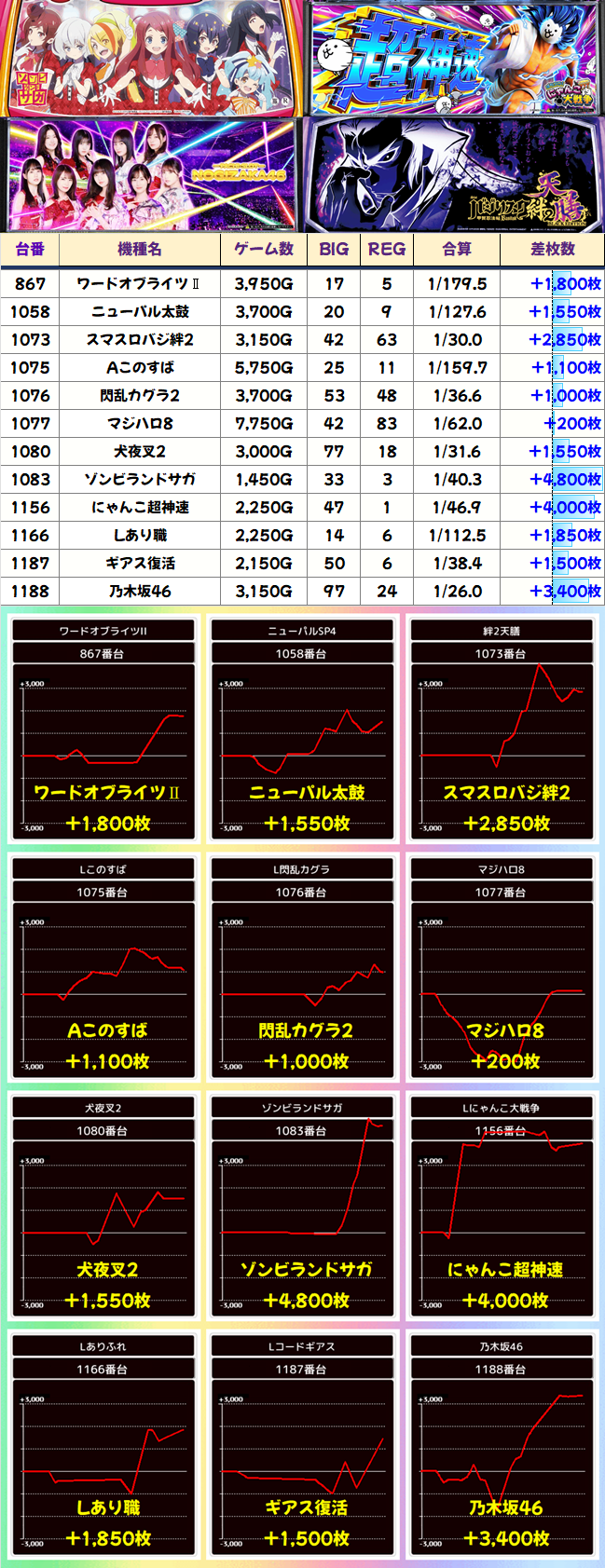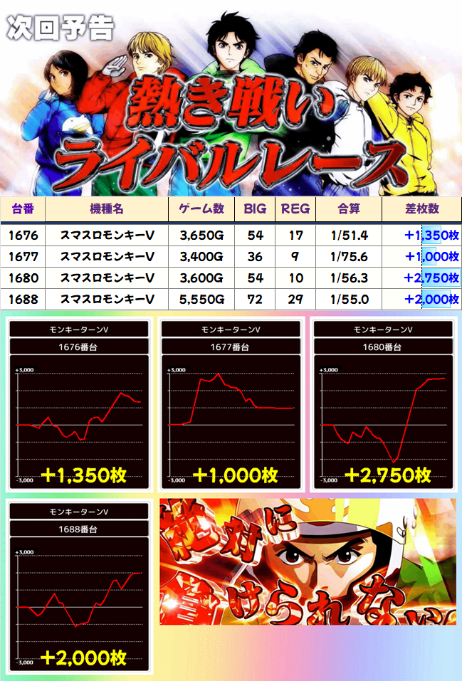 序盤の一撃で勝負を決めた台もあれば山あり谷ありの展開の台もあり。