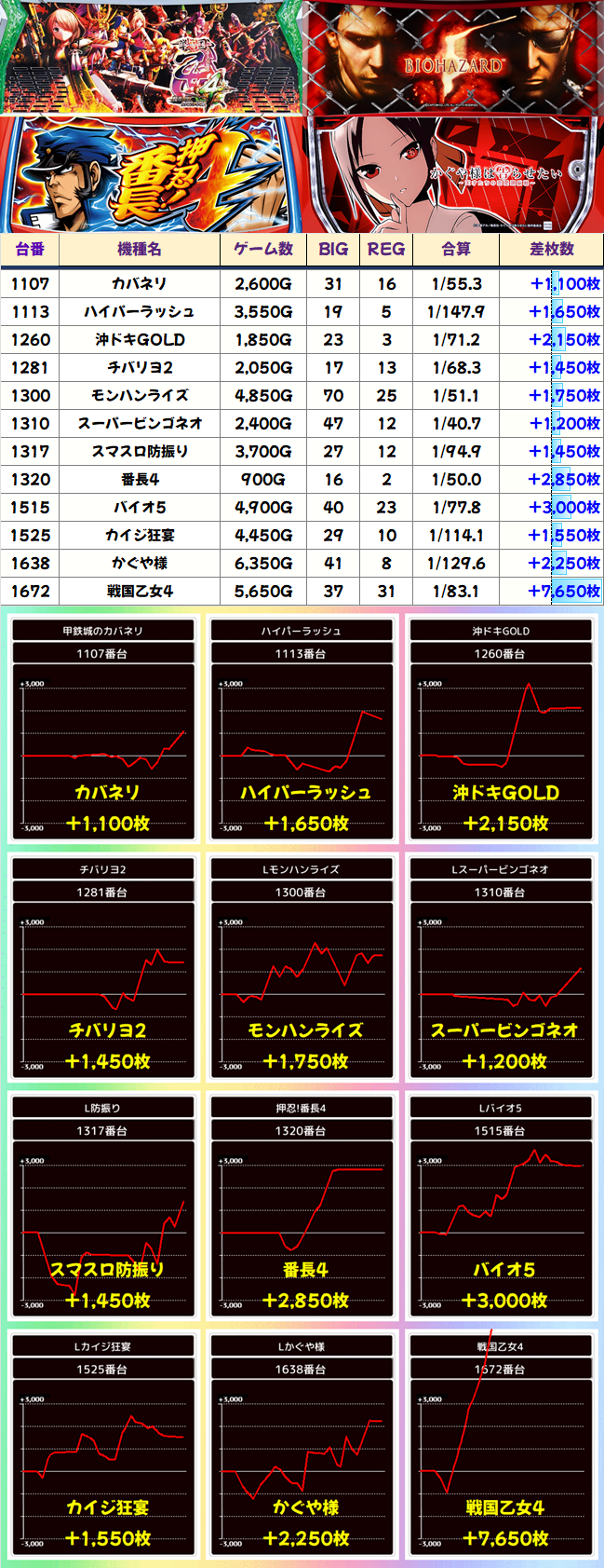 ハイパーラッシュは終盤の連打でプラスに。初当りがとれているバイオ5も優秀な挙動。やはりCZ当選率(=CZランクの移行率)の設定差が初代同様に肝かも。