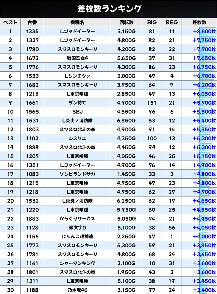 この⑧台区間だけ明らかに平均差枚が高いので、間違いないでしょう。REG回数をみても明らかにレベルが違います。