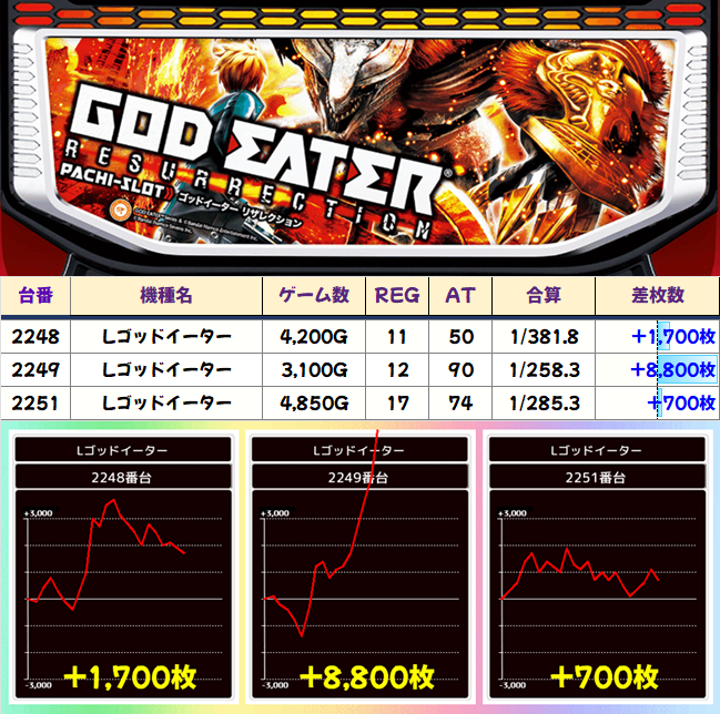 もはや定番ともいうべき5台シマの列、さらに並び仕掛けアリ。加えて他の優秀台も交えてなかなかの結果に!
