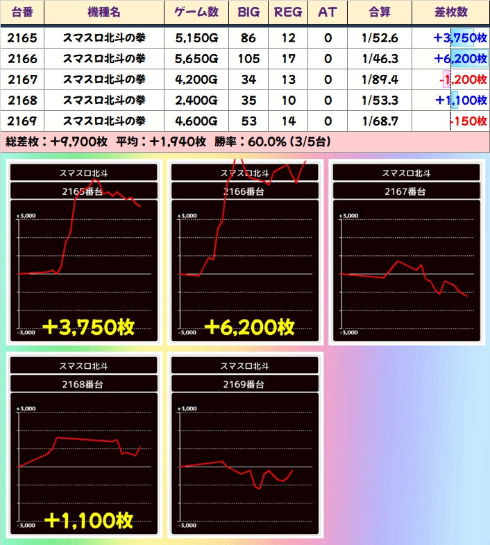 今回も「北斗」は1/2系の安定仕掛け! 列・並びでは高頻度で仕掛けに絡む2161-2203の列から3台並びが出現! この3台並びは平均+2467枚と非常に優秀でした!