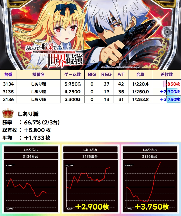 2台機種は台数こそ少ないものの、各機種1台は+5000枚超とかなり高品質台があった様子でした