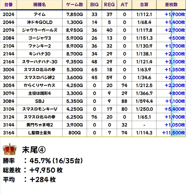 末尾④は全体でみると末尾③には劣るものの、聖矢からは万枚超あり!末尾③は勝率も7割を超えており、全体差枚も優秀でした。特日は日付を関連付けた末尾を探す立ち回りもあり!