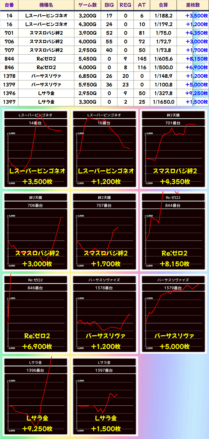 サラ金やリゼロ2からは大量獲得台が複数アリ!ハイスペマシンのバジ絆天膳やバーサスリヴァイズなどまだまだ現役機種もしっかり結果を残す。